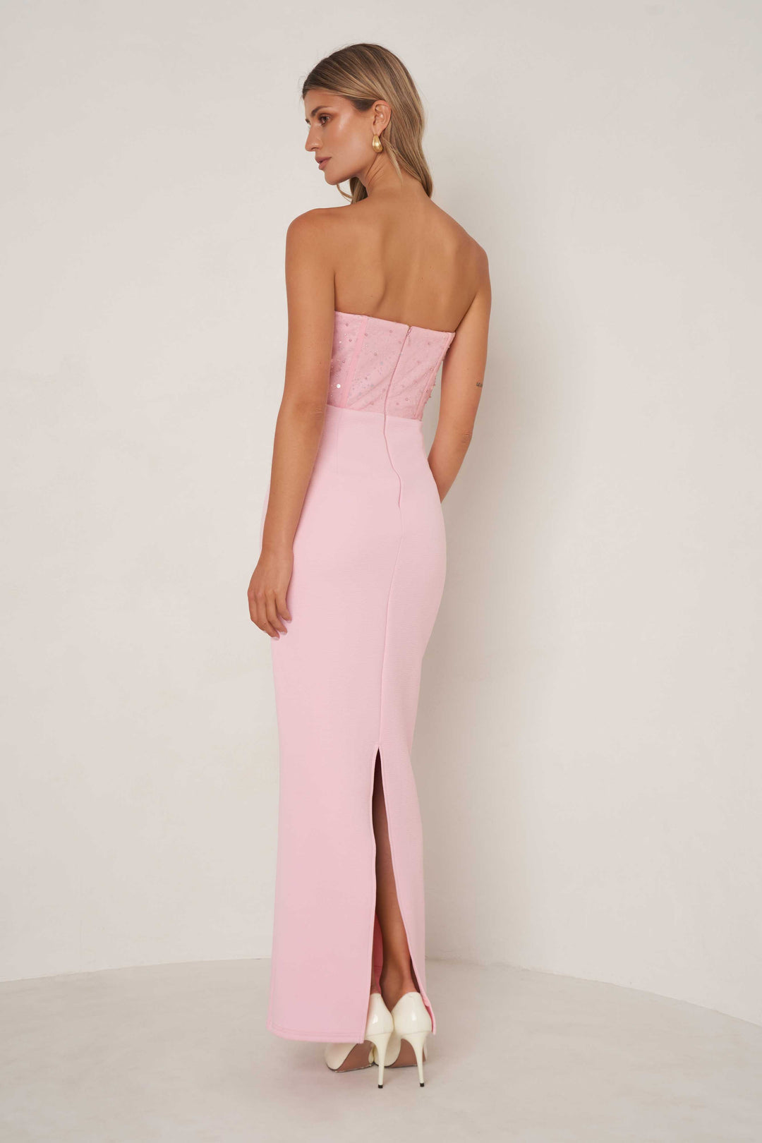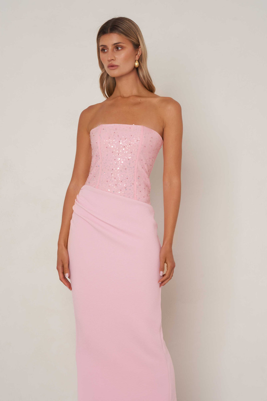 The Anastasia Dress is a stunning maxi featuring a strapless corset design using a combination of sequins and pearls. The skirt is crafted using thick, figure hugging fabrication and features an asymmetrical waist and hip ruching.