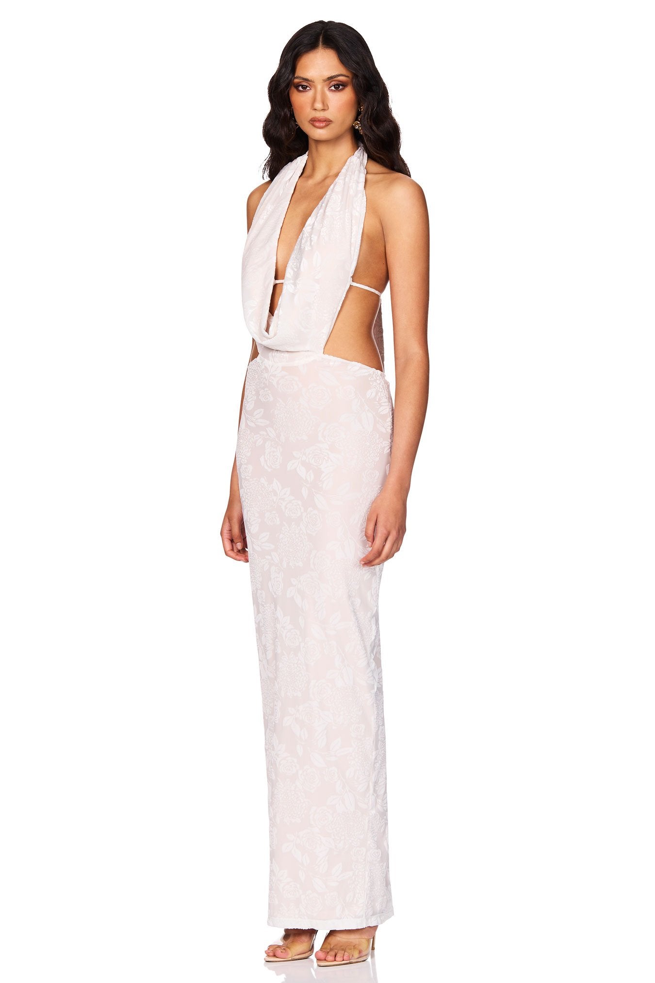 The Nookie Isabella Maxi Dress is a dramatic cut out gown, crafted in a semi-sheer velvet devore fabrication. Featuring a plunging draped neckline, cut out detail at front waist and sexy low back. Halter ties at neck, adjustable strap at back and invisible zip at back waist with striking column silhouette.
