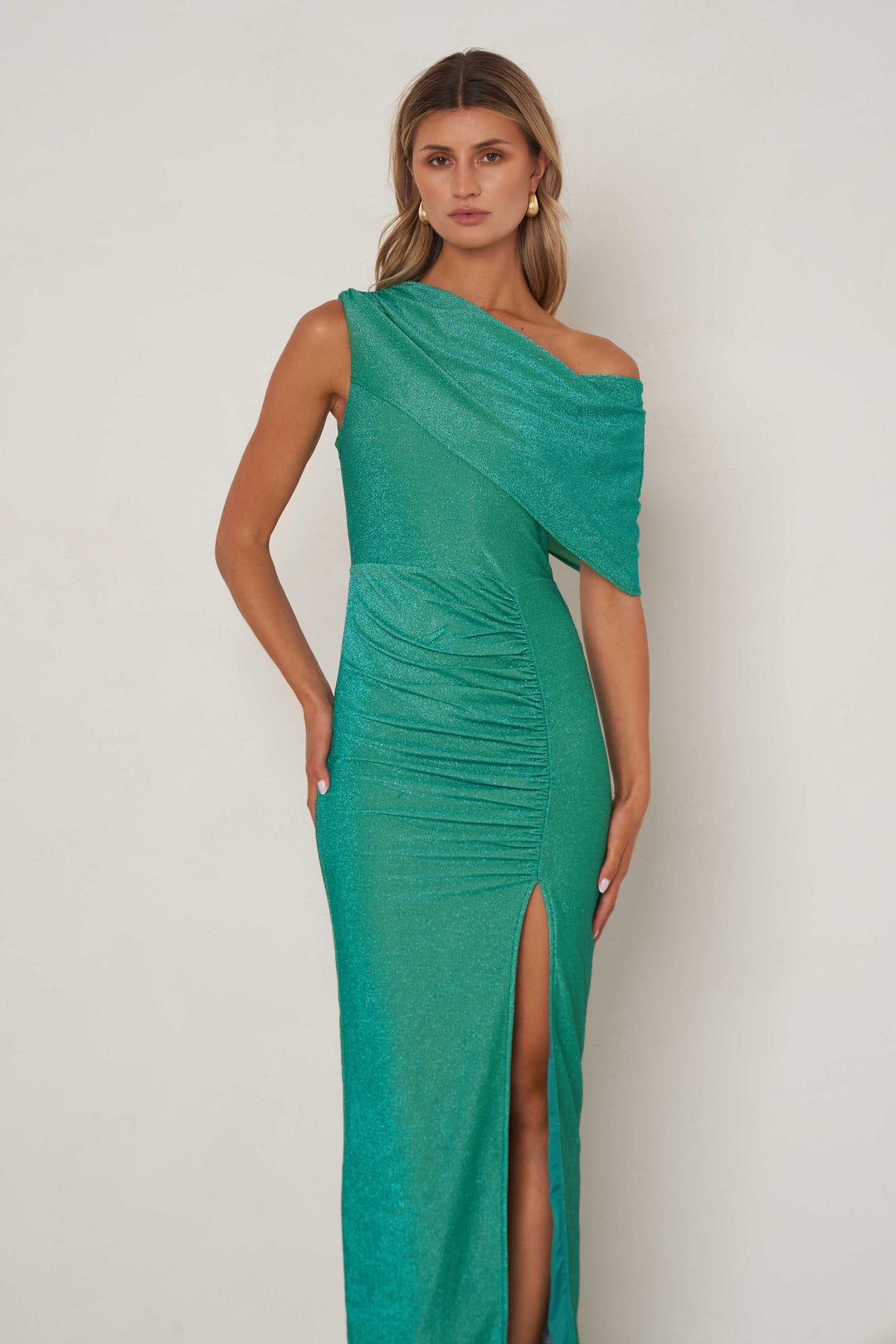 This stunning gown features a one shoulder draped design. The sexy side split and ruching on body to crate a flattering silhouette. This dress is crafted using a stunning stretchy shimmering fabrication.