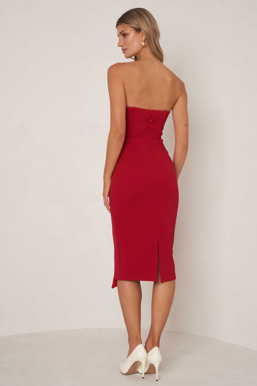 The Sara midi dress is crafted using our signature, figure hugging fabrication. this dress has a strapless asymmetrical neckline, accompanied by a faux button design creating a sleek and sexy silhouette. Also available in White.