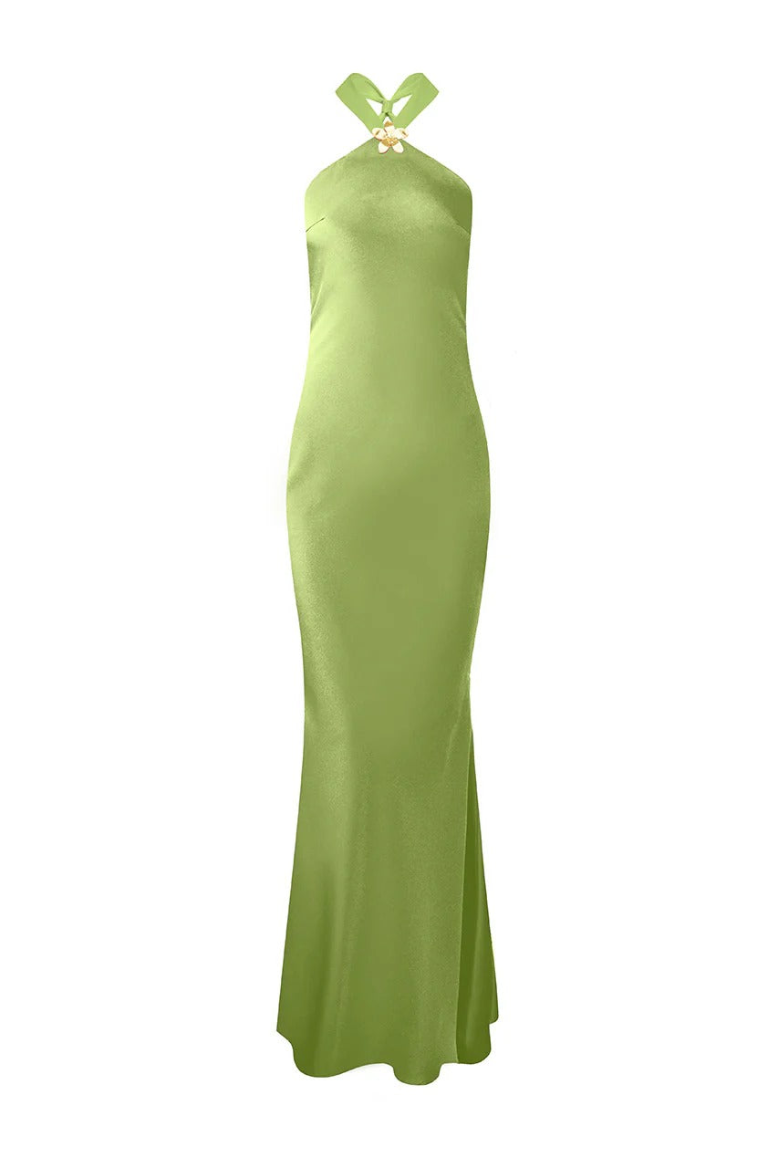 Our Chara Maxi Dress features a floral brooch to add some shine, with an open back that shapes the body for a flattering look and feel.