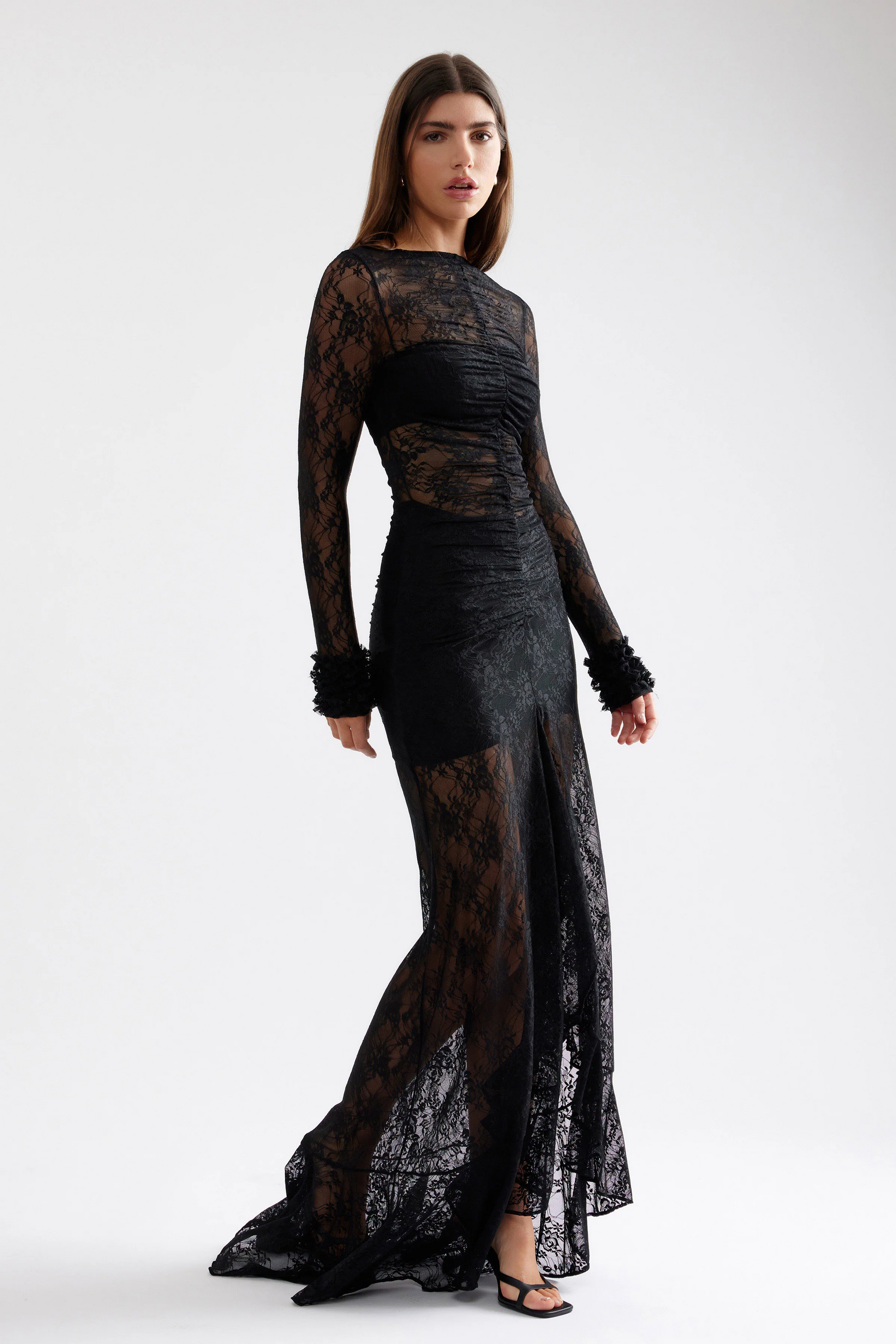 • Floor length gown with sheer lace