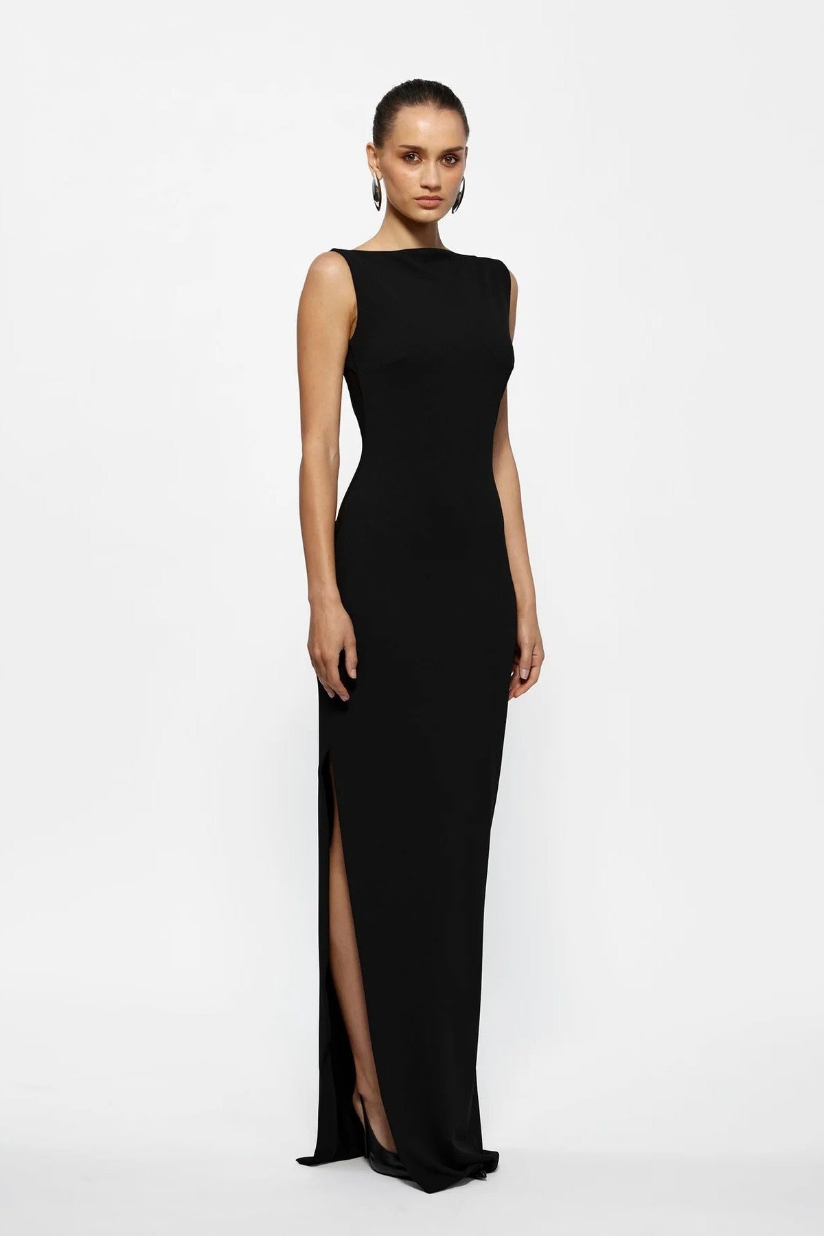 A perfect balance between timeless evening dressing and seductive allure, we welcome the Aisha Gown. Featuring our classic neckline and silhouette with a mesh cutout to accentuate the back figure. Aisha is an ode to modern glamour that is subtly yet elegantly sheer in it’s finish. Perfect for romantic evenings and eventing.