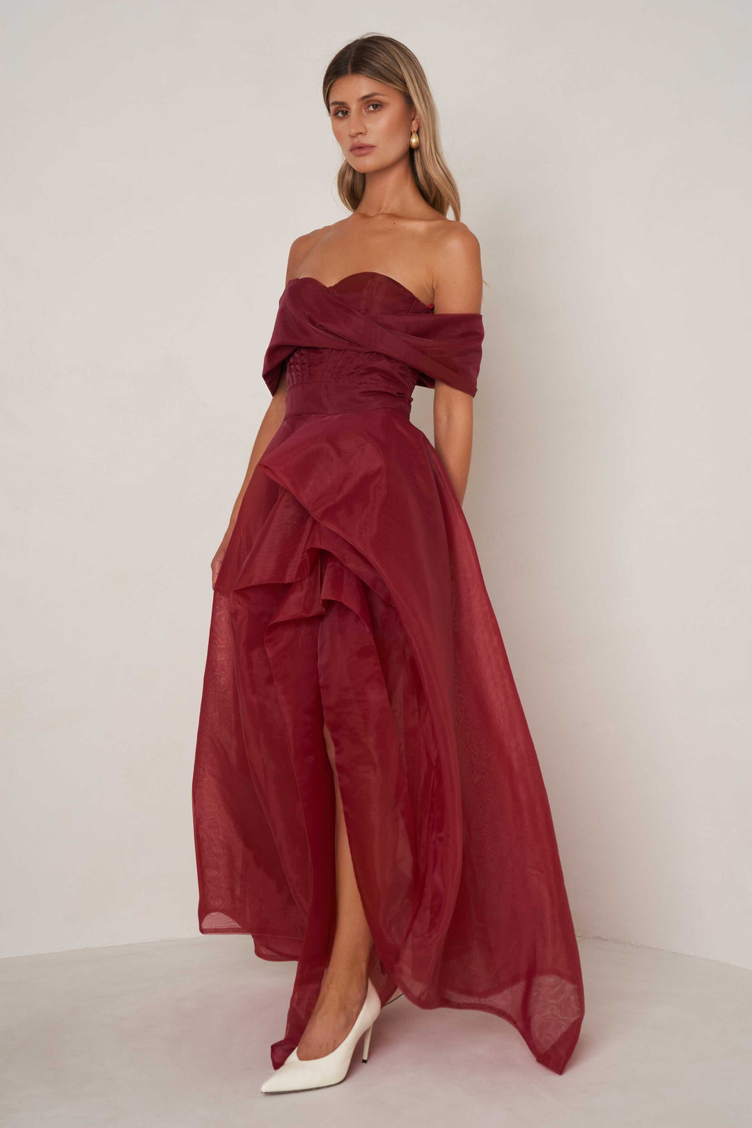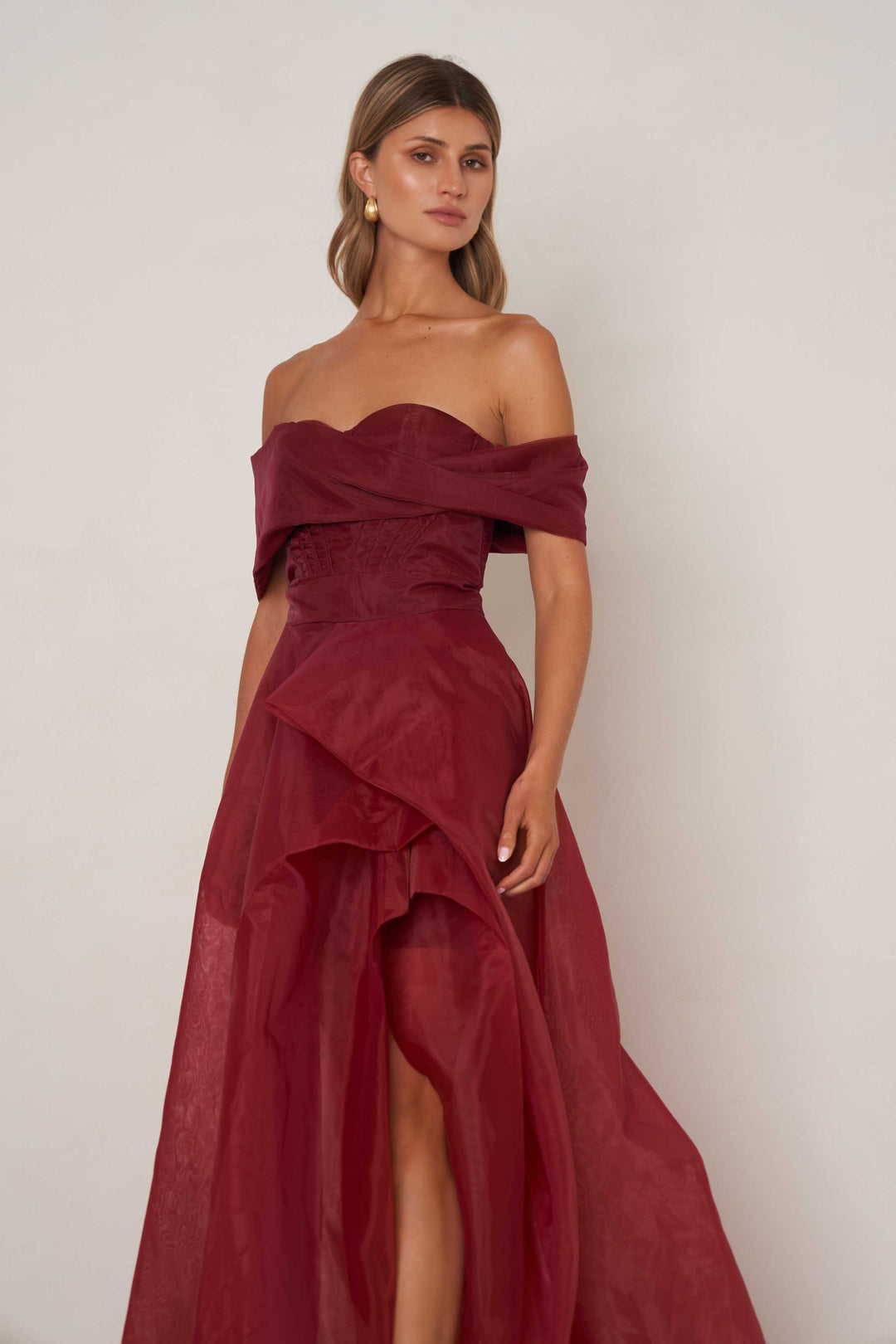 This show stopping gown features a structured off the shoulder neckline draped over a corset style bustier top.. The skirt features gathered organza that nips and tucks to create a stunning voluminous skirt.