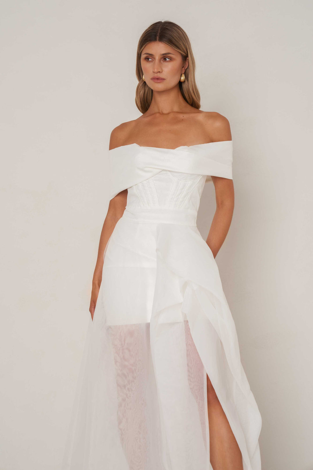 This show stopping gown features a structured off the shoulder neckline draped over a corset style bustier top.. The skirt features gathered organza that nips and tucks to create a stunning voluminous skirt.