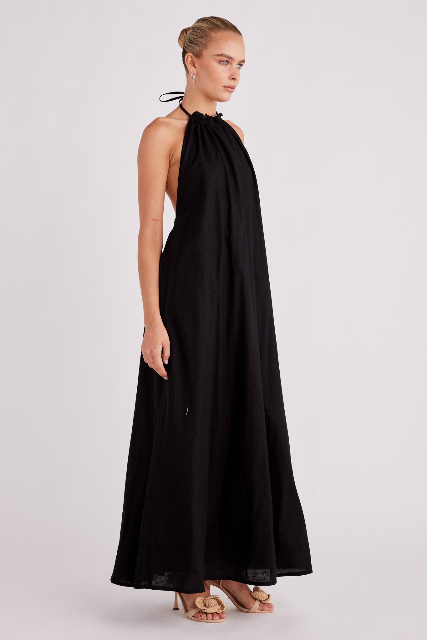 Our Alysse Halter Maxi Dress is a linen cotton blend fabric. The maxi length dress has an exposed back and elasticated waistline, it also has a high neck halter top with a drawstring neckline. The perfect mini that can be dressed up or down and worn on vacation. It looks amazing paired with delicate necklaces in golds and silvers, statement sunnies and slides!
