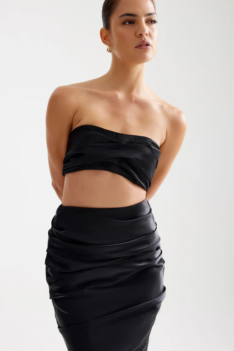 The Ariana Set is a striking two-piece ensemble crafted from liquid-look fabric that shimmers with every move. The bandeau-style top features elegant tucking, creating a structured yet fluid silhouette. The skirt mirrors this design with soft ruching and a sleek, floor-length finish. A bold yet refined choice for effortless sophistication.