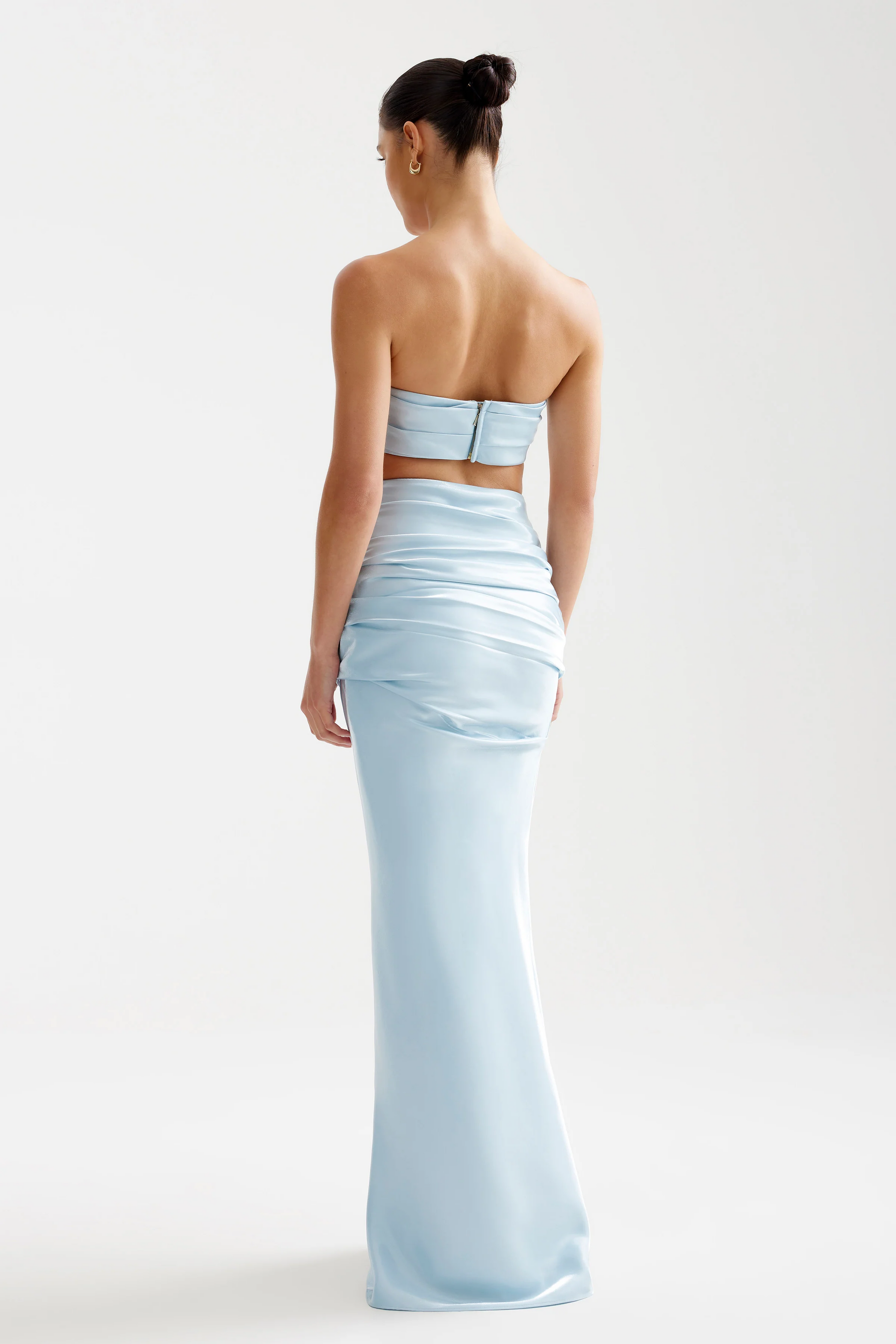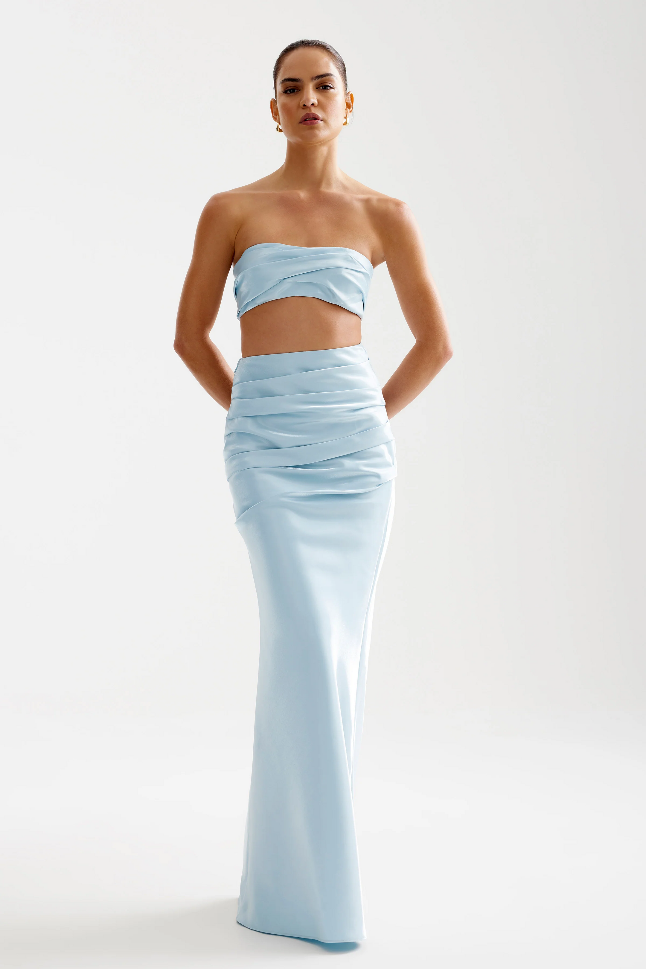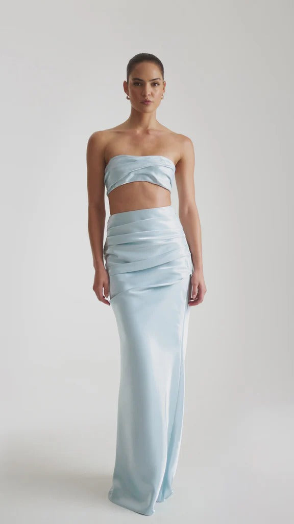 The Ariana Set is a striking two-piece ensemble crafted from liquid-look fabric that shimmers with every move. The bandeau-style top features elegant tucking, creating a structured yet fluid silhouette. The skirt mirrors this design with soft ruching and a sleek, floor-length finish. A bold yet refined choice for effortless sophistication.