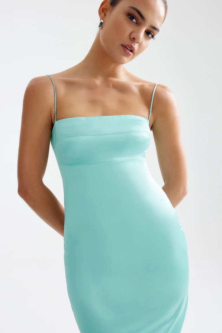 The Bora Dress features an elegant straight silhouette with a sexy low exposed back. The straight across neckline is paired with horizontal topstitch detailing across and under the bust. Cut from our midweight stretch satin this is the perfect dress for any special occasion.