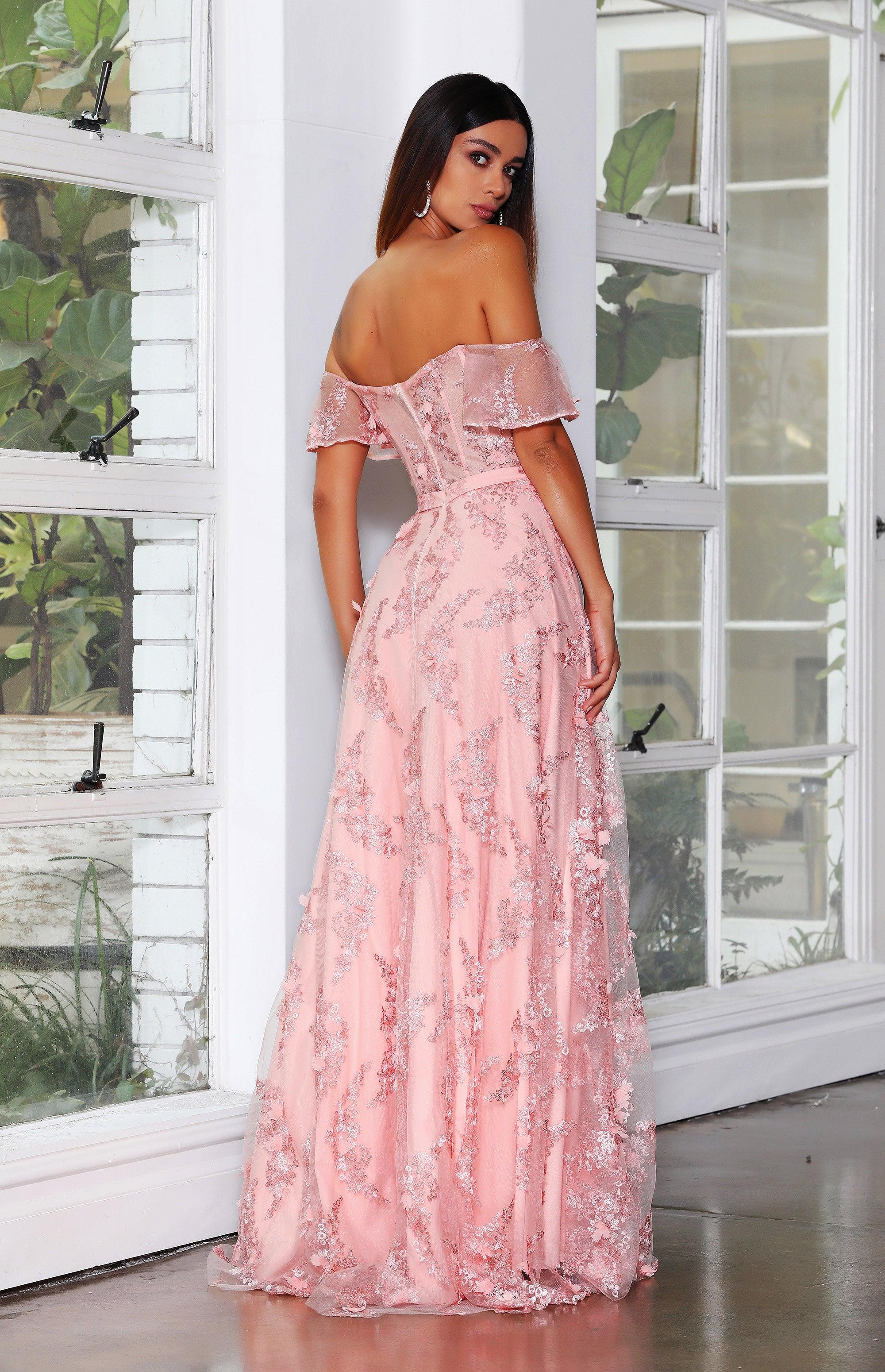 This gown is stunning, the Enchanted Gown by Jadore features an off the shoulder neckline with gorgeous 3D floral detailing throughout.