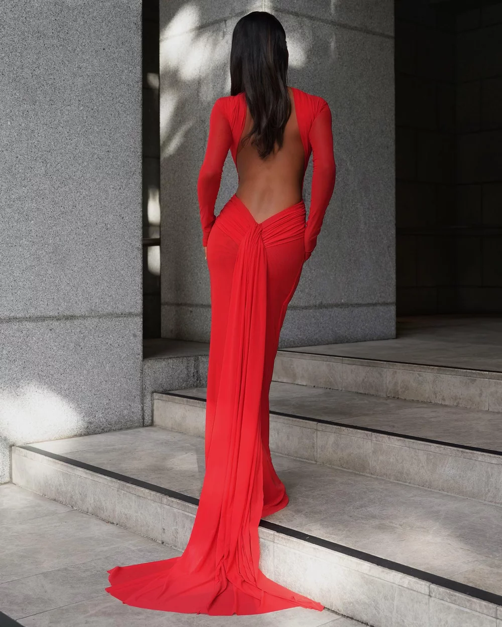 Welcoming the Monaco Gown, where vintage elegance meets modern allure. Crafted from our luxurious soft mesh, Monaco features a high neckline and full sleeves with a daring open back for a touch of sensuality. Detailed with intricate ruching through the bodice and a crossed detail across the waist to cinch in the silhouette. Made to sculpt and highlight the feminine form, the Monaco Gown will ensure timeless dressing with effortless charm.