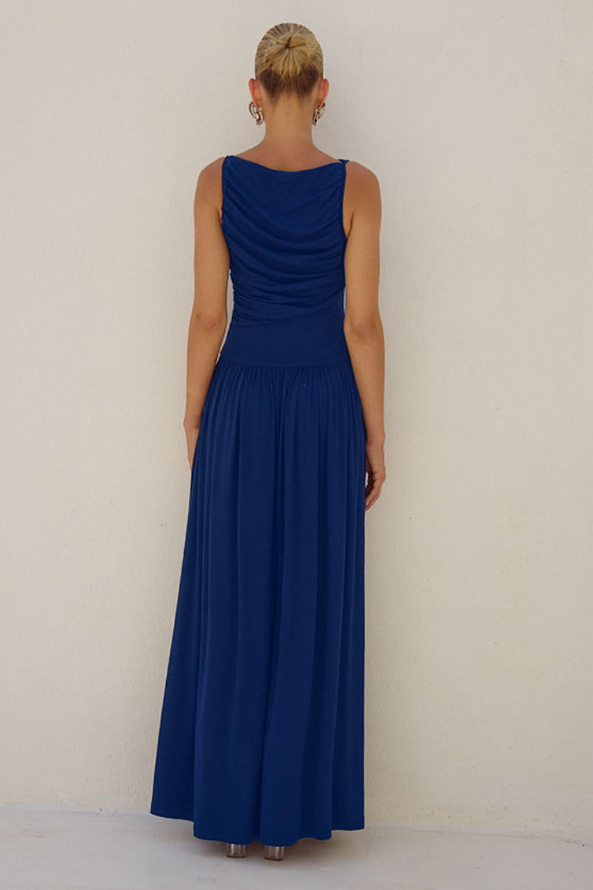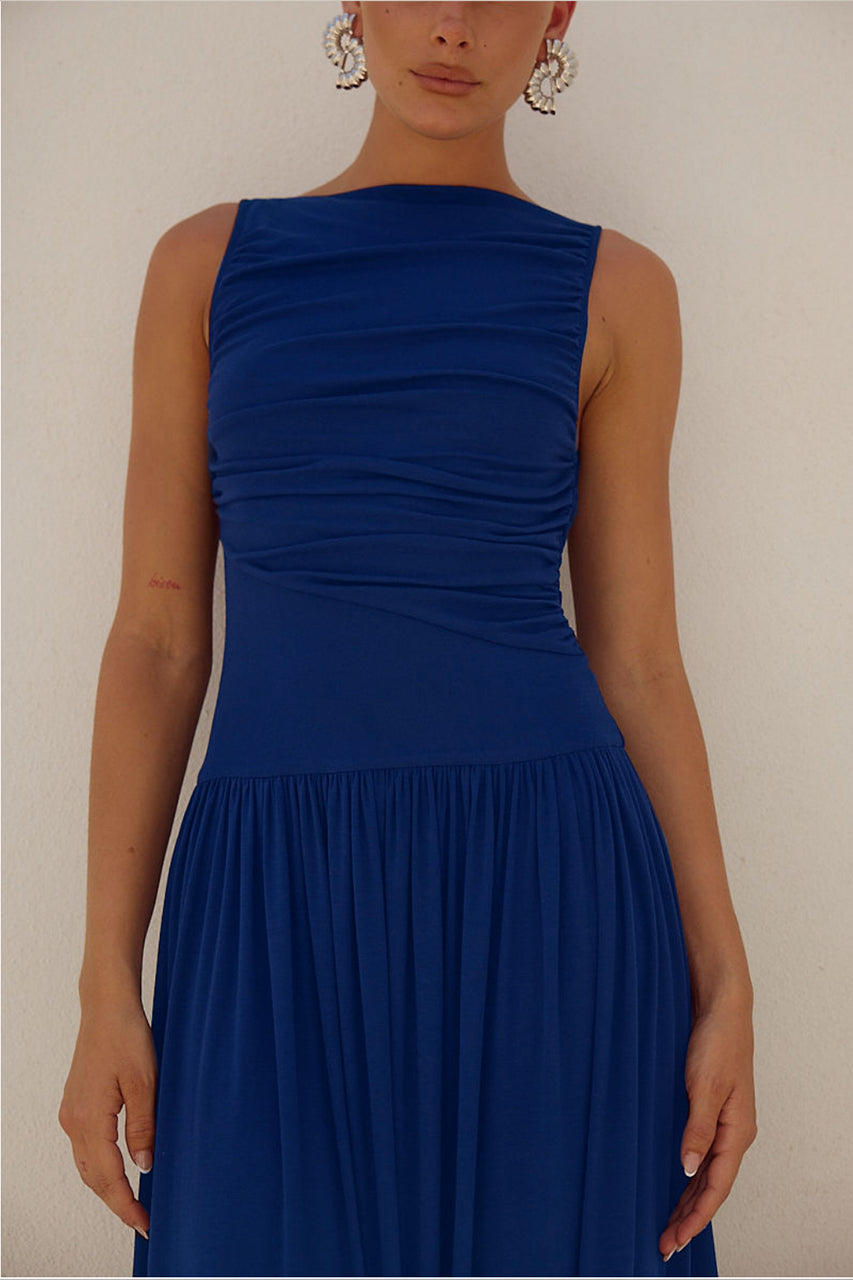 Our Nalla Maxi Dress showcases effortless elegance, with a boat neck and ruching throughout, it’s a versatile and timeless piece.