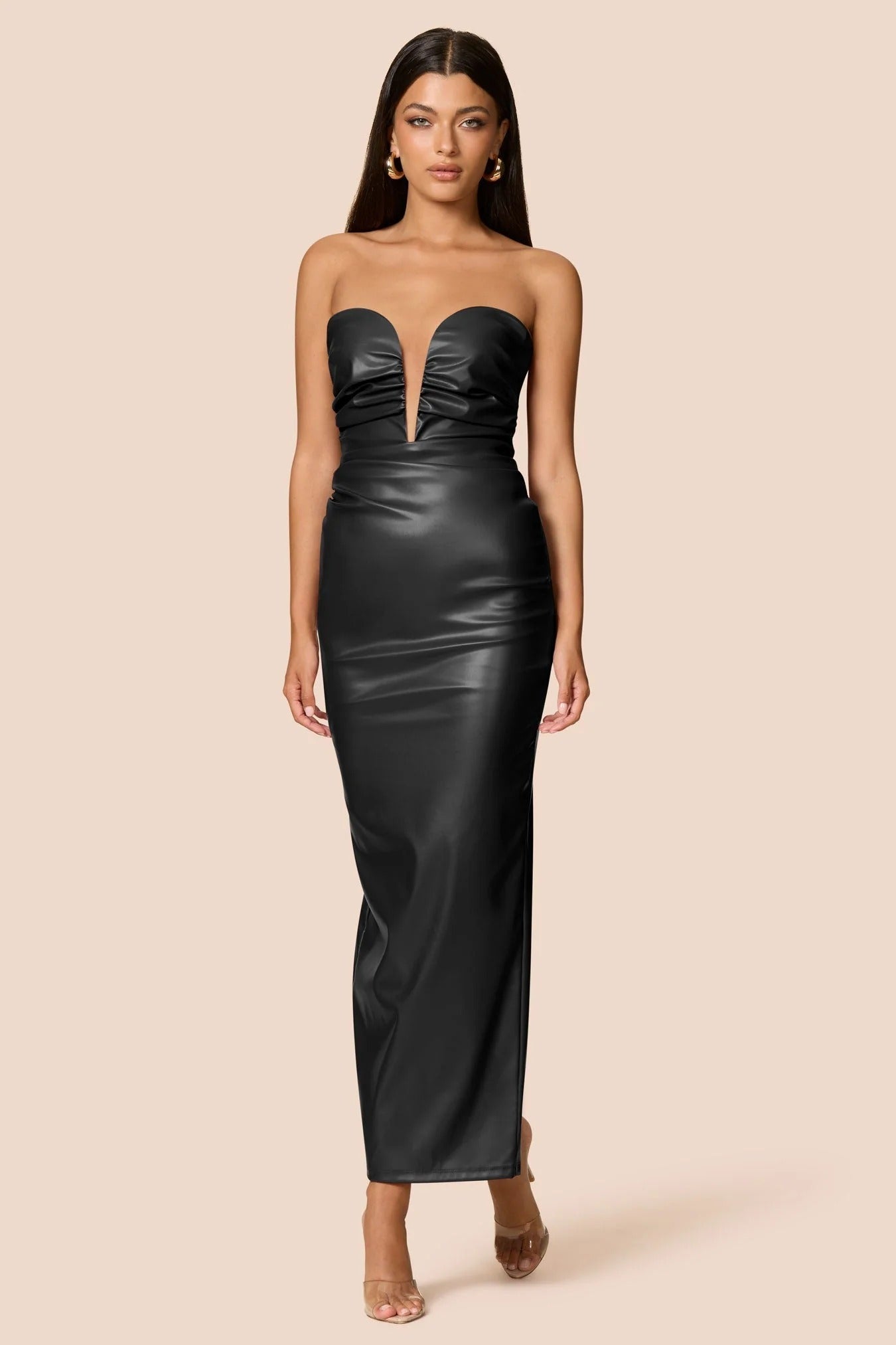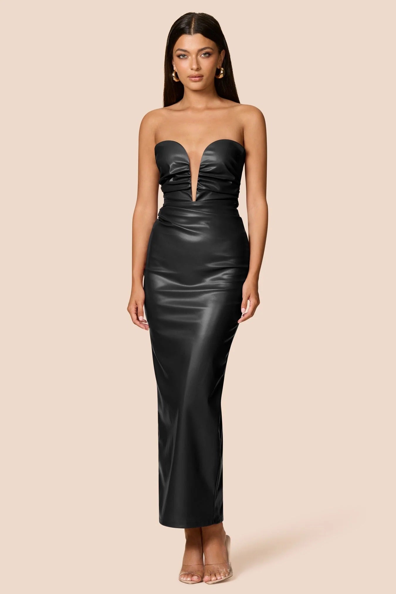 The Nookie Evoke Maxi Dress is a striking strapless maxi with a deep plunging neckline and ruched body. It is crafted from our signature stretch faux leather fabrication. It features an exposed metal zip at the back, split at the hem, and is fully lined.