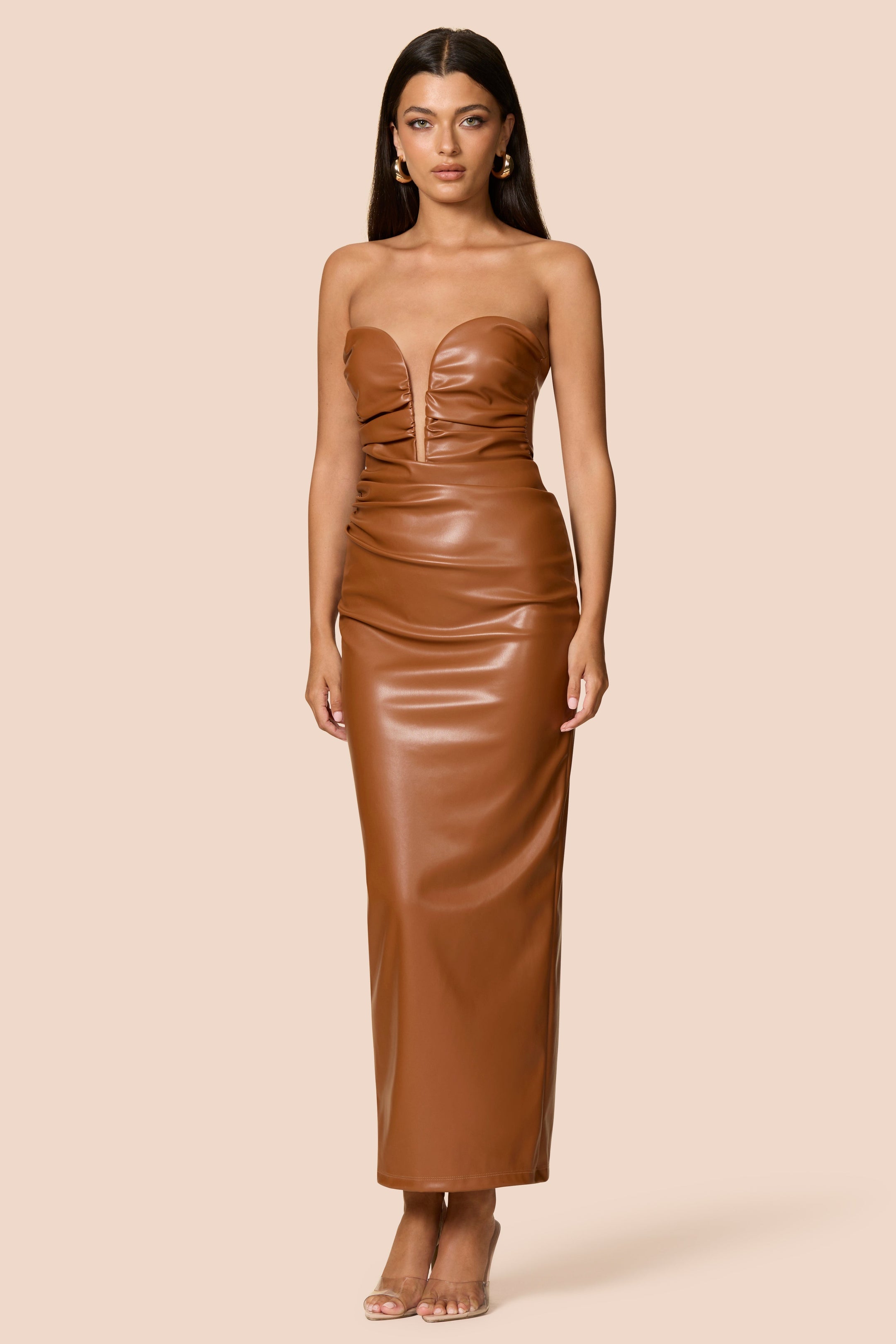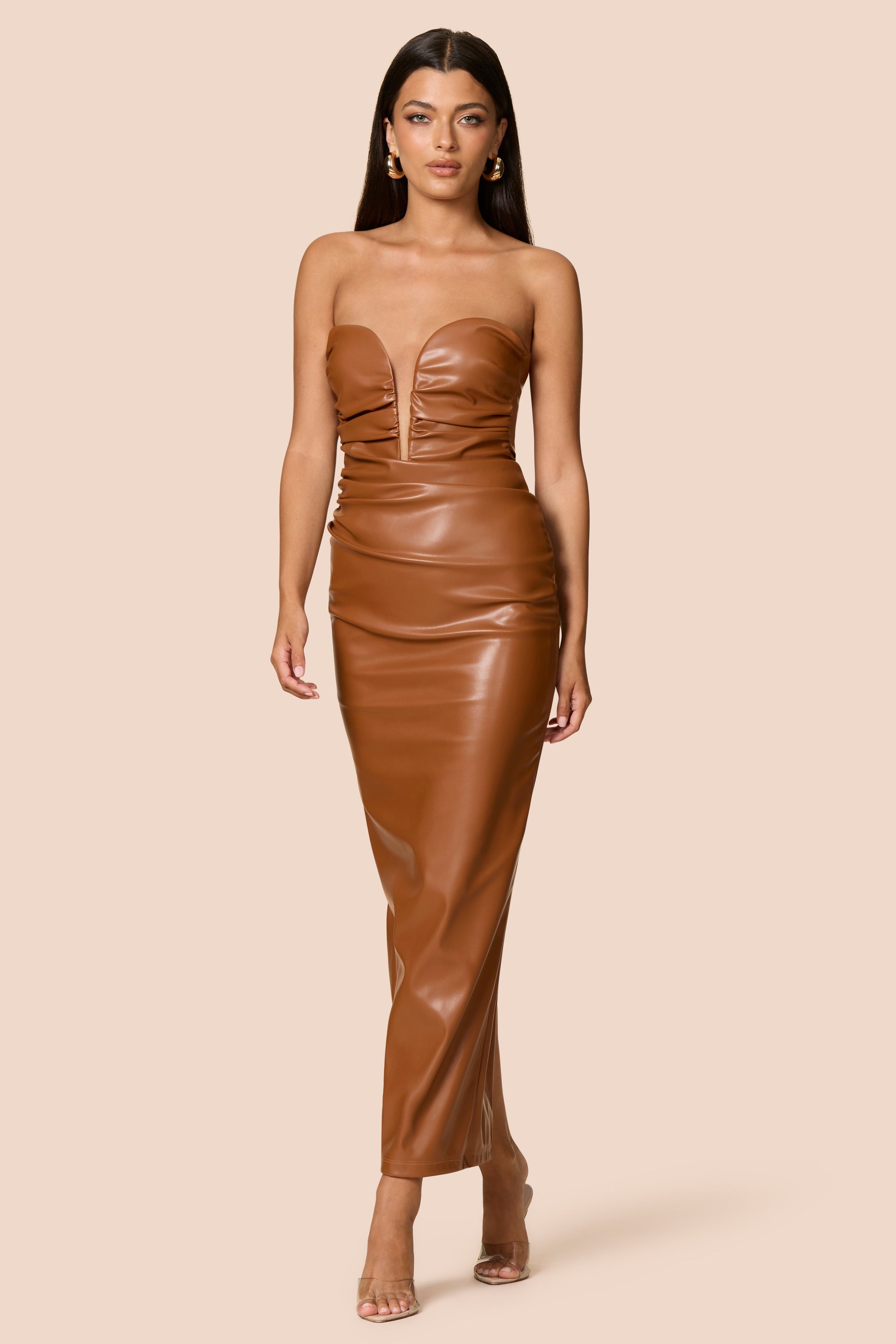 The Nookie Evoke Maxi Dress is a striking strapless maxi with a deep plunging neckline and ruched body. It is crafted from our signature stretch faux leather fabrication. It features an exposed metal zip at the back, split at the hem, and is fully lined.