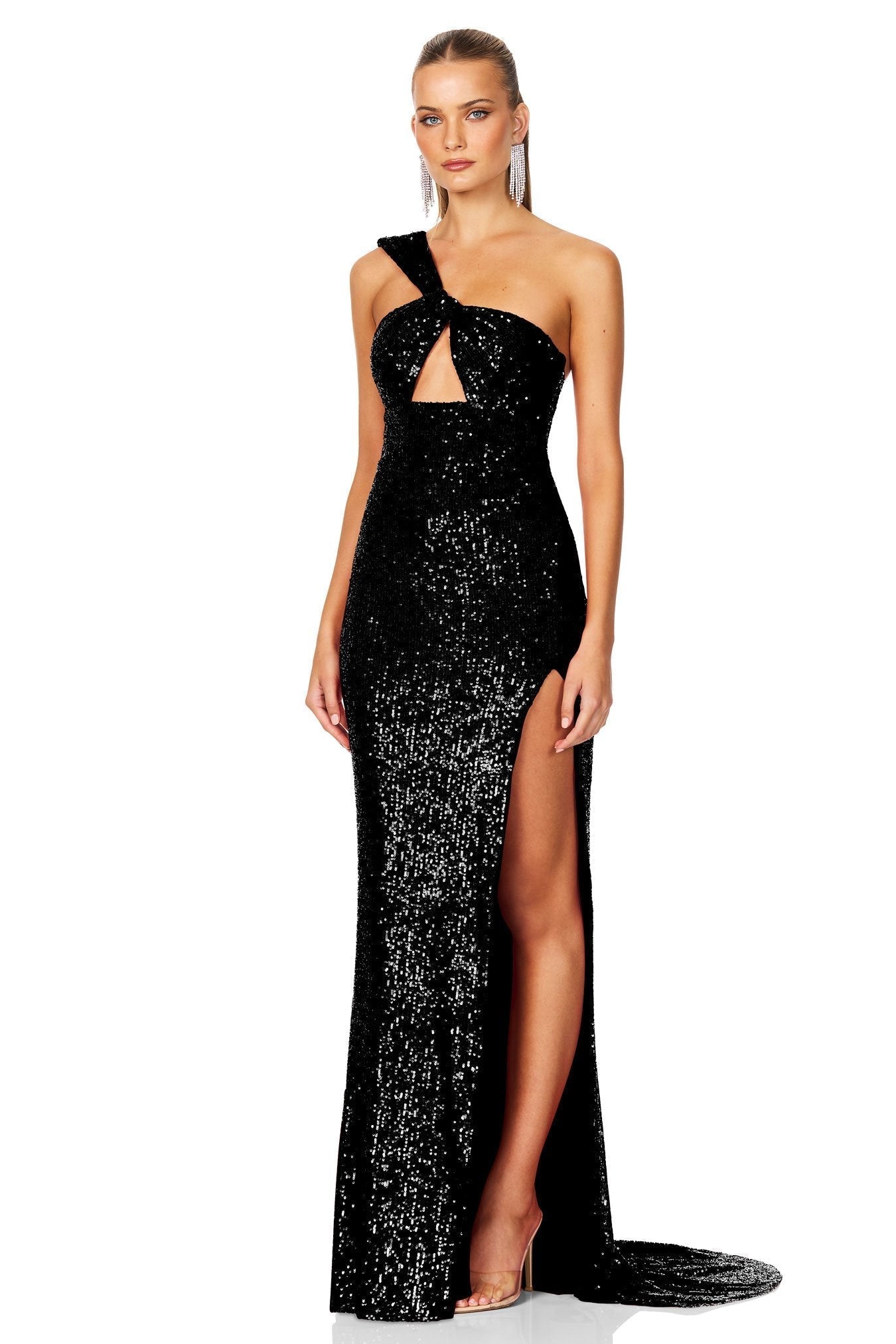 The Therese Sequin Gown is a glamorous one-shoulder sequin gown with subtle gather at side waist, boning in bodice and thigh high split at side leg. This elegant gown has an exaggerated train at back and invisible zip closure at center back. Crafted in our signature stretch sequin, fully lined.