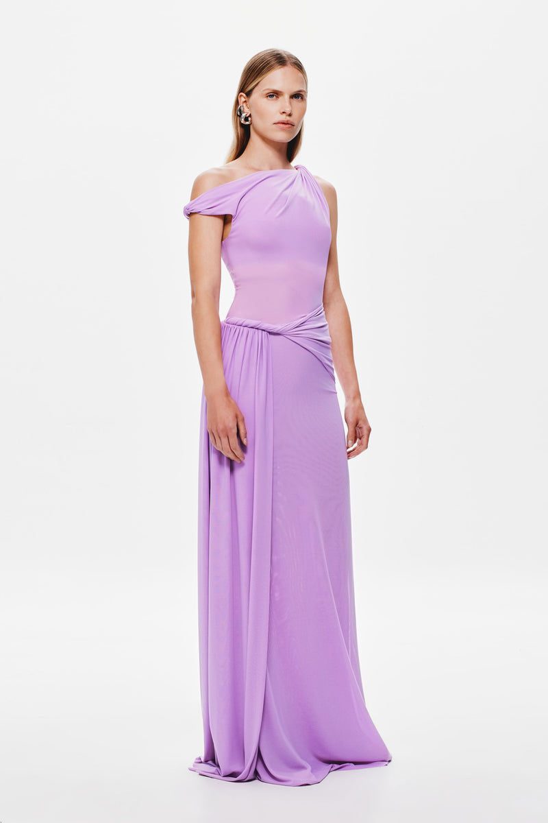 The Misha 'Sisal' Mesh Maxi Dress in Lilac, an effortless, yet sexy draped silhouette that skims the body.