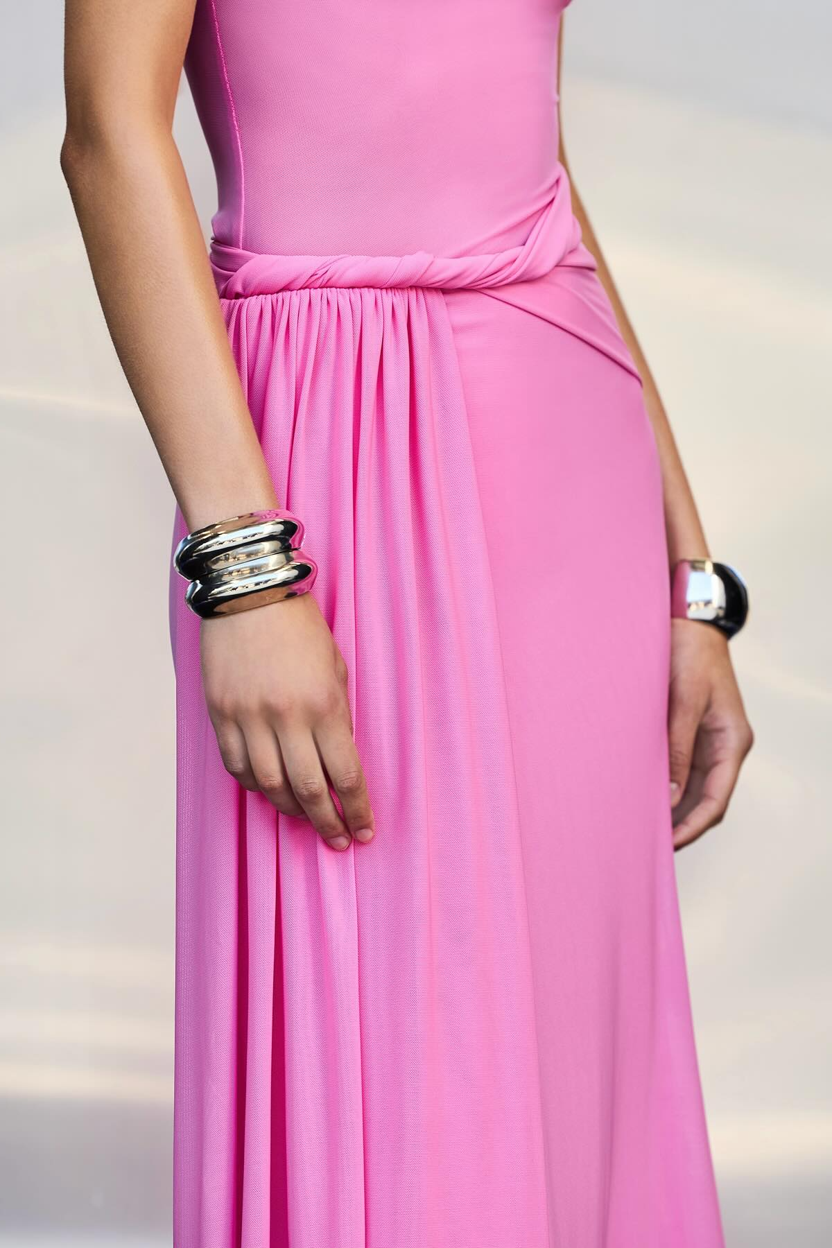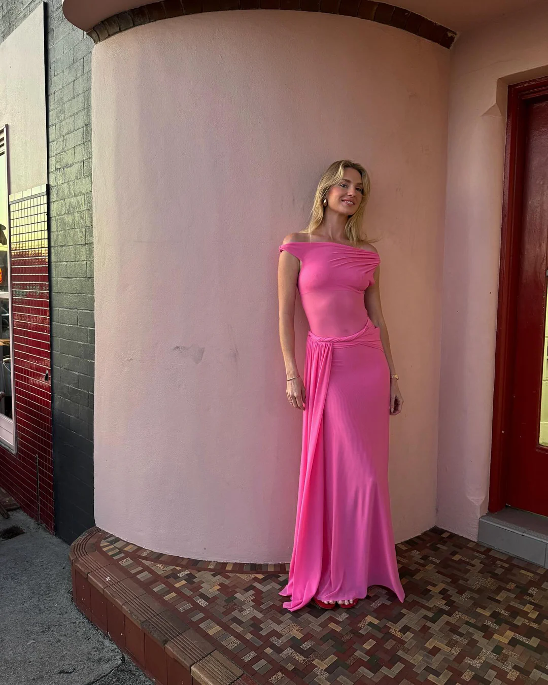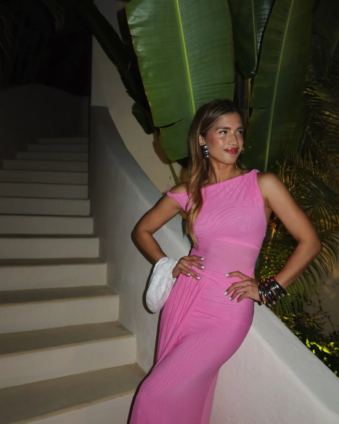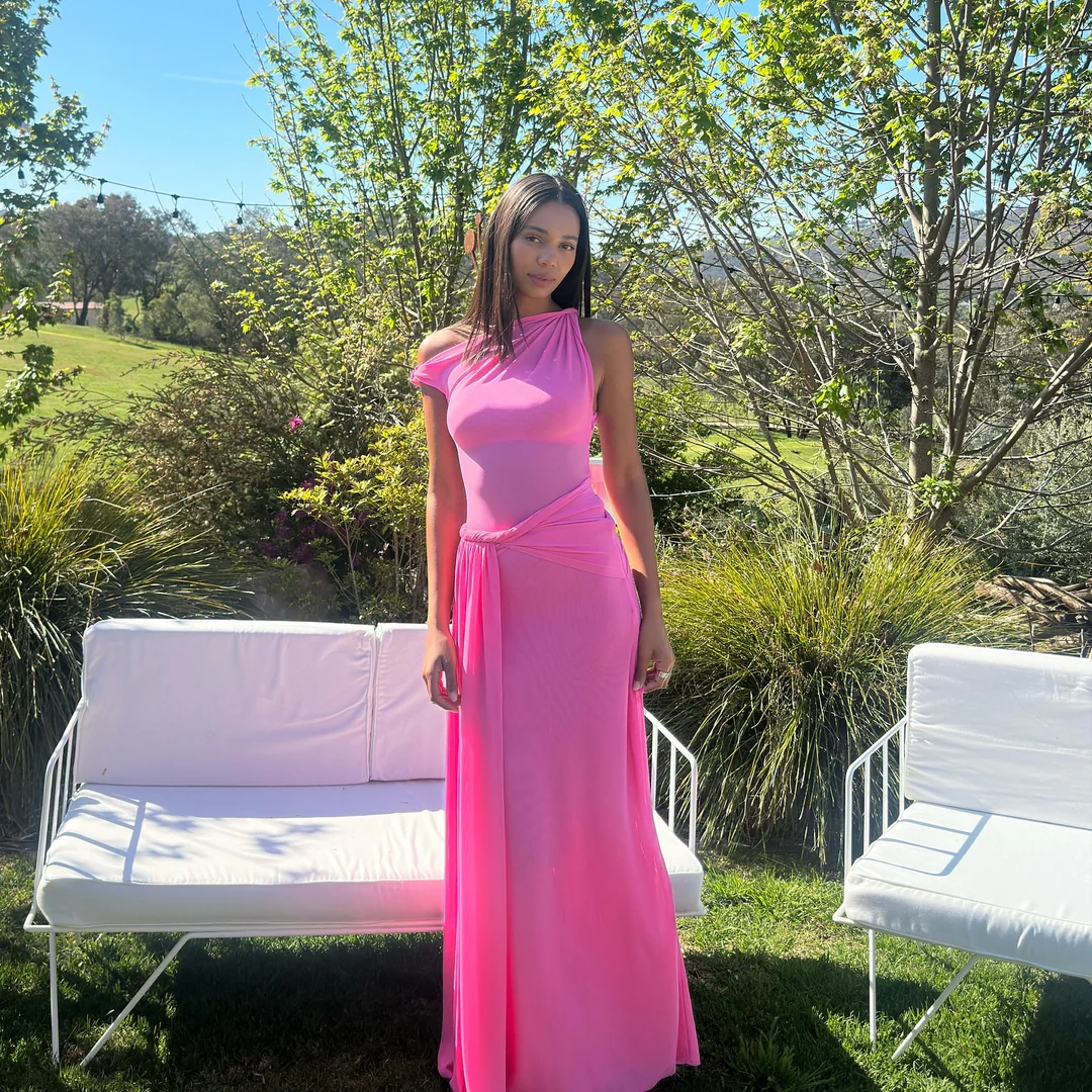 The Misha 'Sisal' Mesh Maxi Dress in Orchid Pink, an effortless, yet sexy draped silhouette that skims the body.