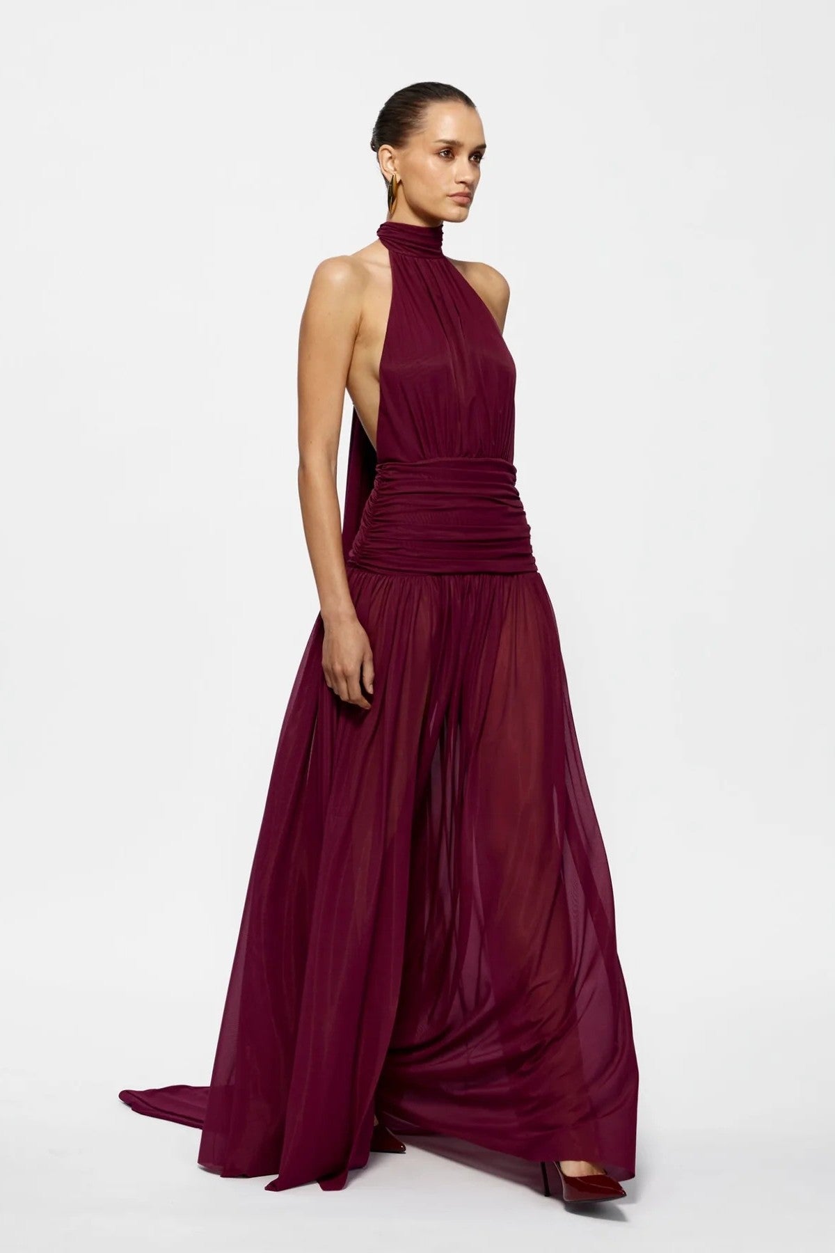 Introducing the Verity Gown, a romantic blend of sensual allure and vintage charm. Crafted from our soft and buttery mesh that beautifully flows and drapes across the body. The Verity Gown focuses on flattering the feminine form, featuring a halter style neckline that blends seamlessly into a full length maxi skirt. Intricately detailed with ruching and texture along the bodice, Verity features a gorgeous open-back with a plunging train along the back of the silhouette. Made to be a timeless classic, to be worn for seasons to come. Made to be slightly sheer.