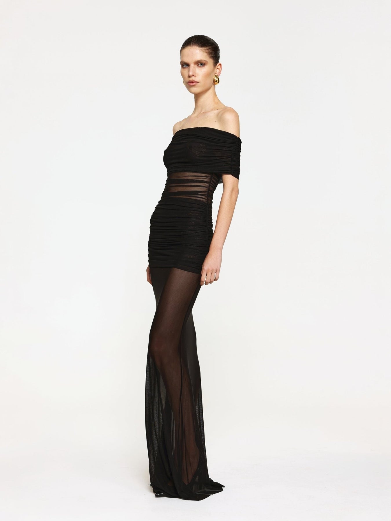 The perfect gown for the warmer seasons ahead. Our Windsor Gown features delicate ruching across the body with an off shoulder cut for the most flattering silhouette. Doubled lined across the bodice and bottom for added coverage. Made with our signature soft mesh fabrication. This piece is made to be slightly sheer.