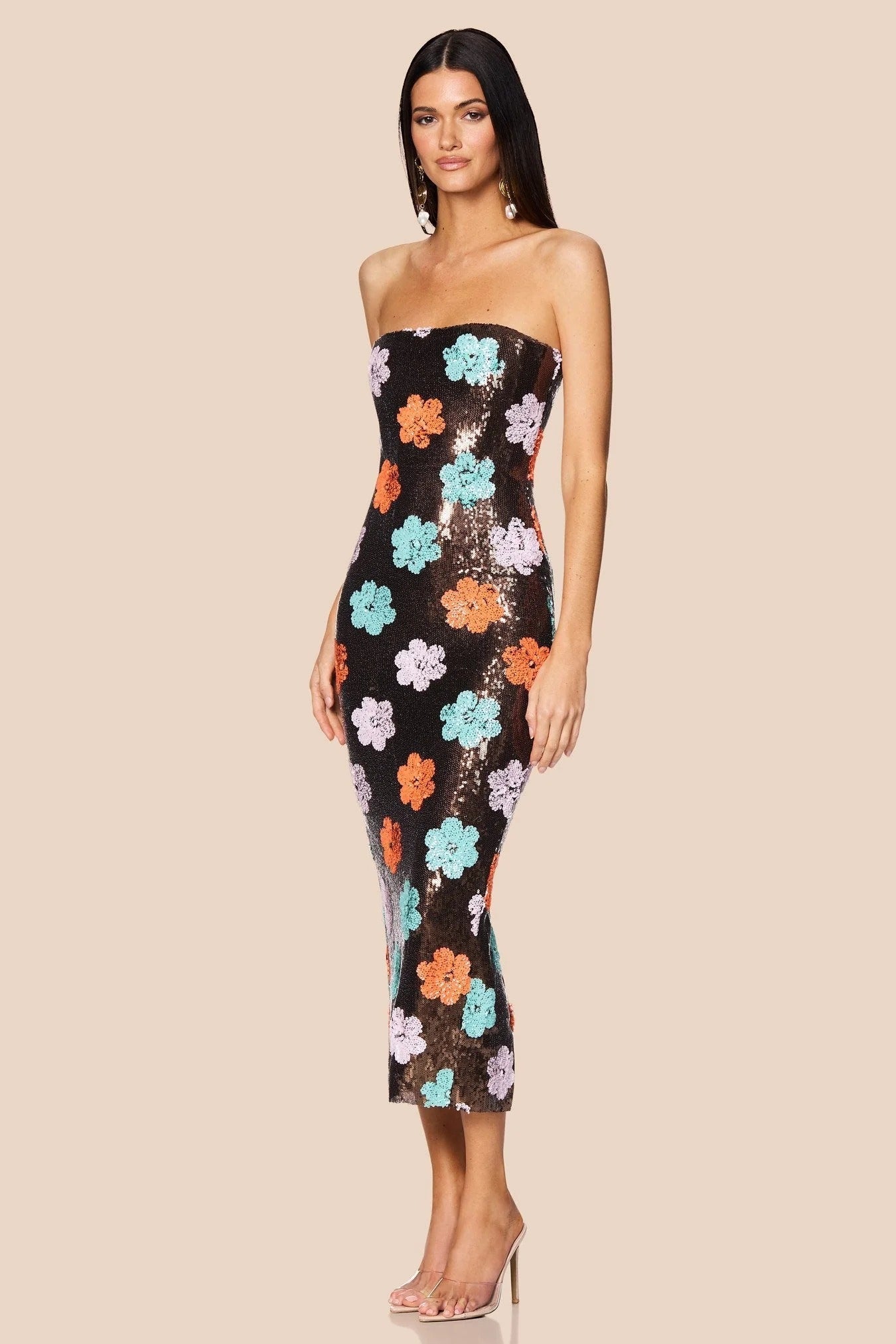 The Nookie Sienna Midi Dress is a floral sequin strapless midi dress with a structured inner bodice. It is crafted in a floral sequin. It features an invisible zip at the back, and is fully lined.