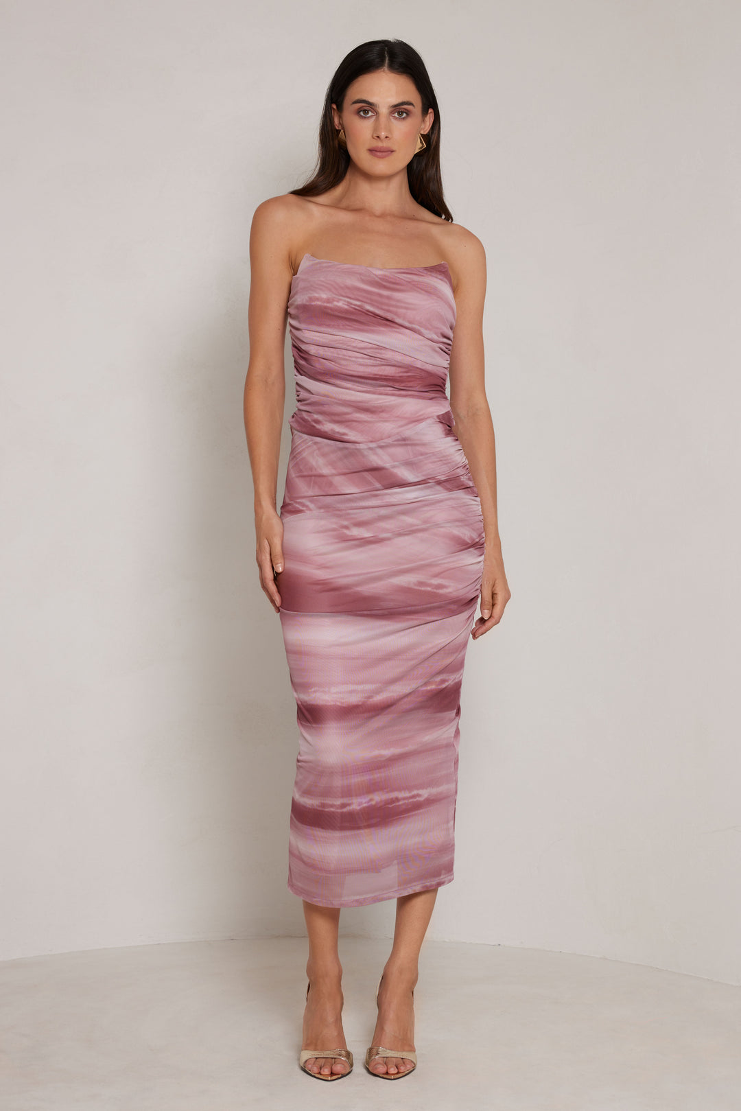 This dress is a strapless, form-fitting design with a pink, horizon-like pattern. It has a ruched texture, creating a flattering silhouette. The length is midi, making it elegant and suitable for any occasion.
