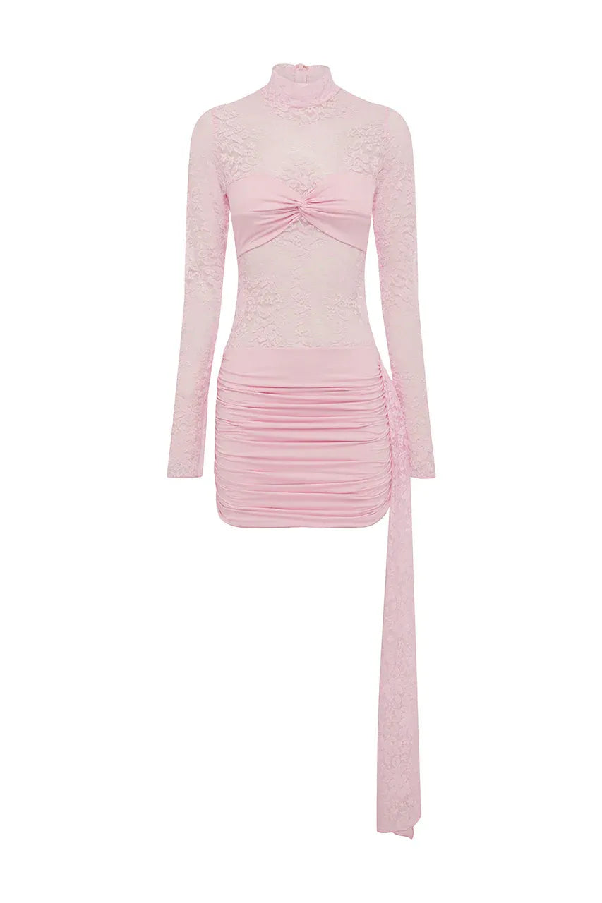 A soft pink hue and delicate lace, our Larna Sleeved Mini Dress features a lace sash and contrasting textures, perfect for a night out in Pairs.