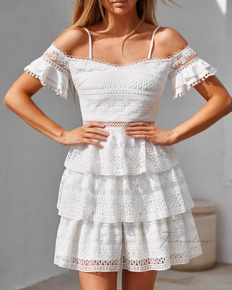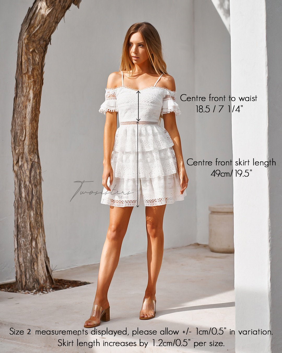 The Melinda Dress in White is stunning for your next event. It has an off the shoulder neckline with removable straps and has a full volume 3-tiered skirt in a gorgeous lace. It has an invisible zipper at the center back.