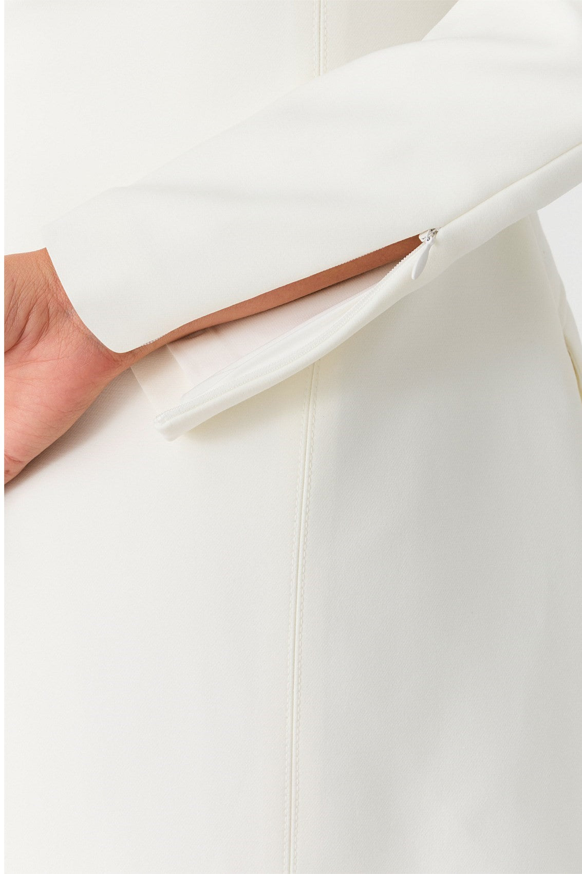 The Molly in Ivory, elegant and demure, the perfect cocktail dress. Molly highlights the decolletage through her off-the-shoulder design. The long sleeves provide extra coverage for the wearer, while the short length highlights the legs. This is perfect for dancing away through long nights. She features classic tailoring elements that accentuate the body. Style her with a pair of pointed-toe pumps to finish the look.