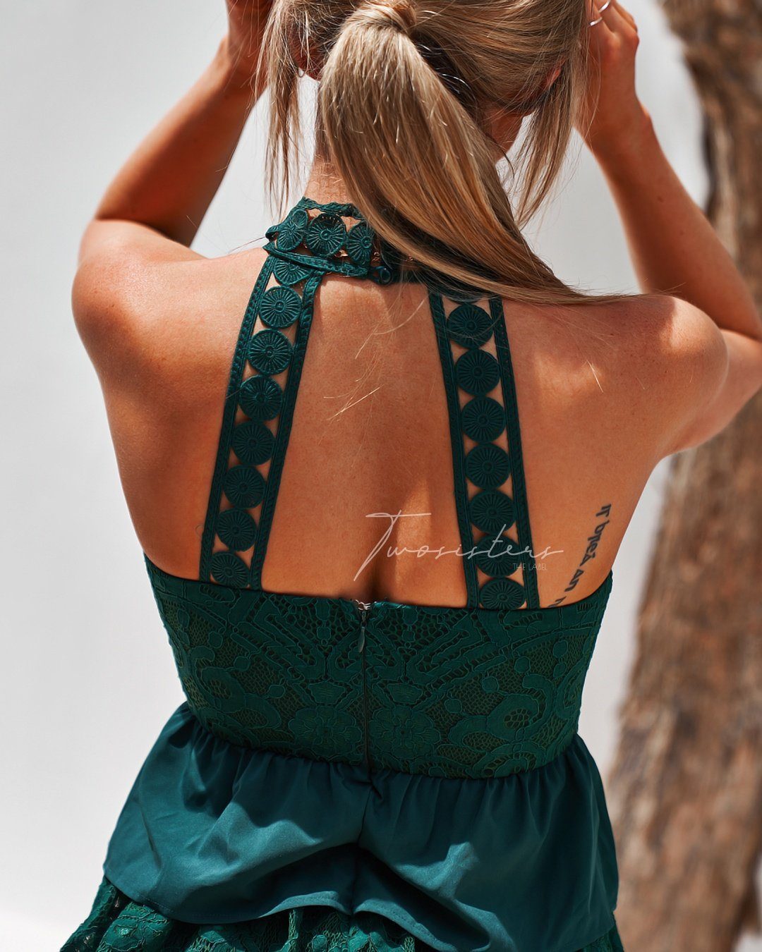 The Jackie Dress in Green is ultra unique. It is a mini dress with a halter neckline with gorgeous custom lace detailing. It has a button and loop closure at the back, with lace trimming that continues down the back.