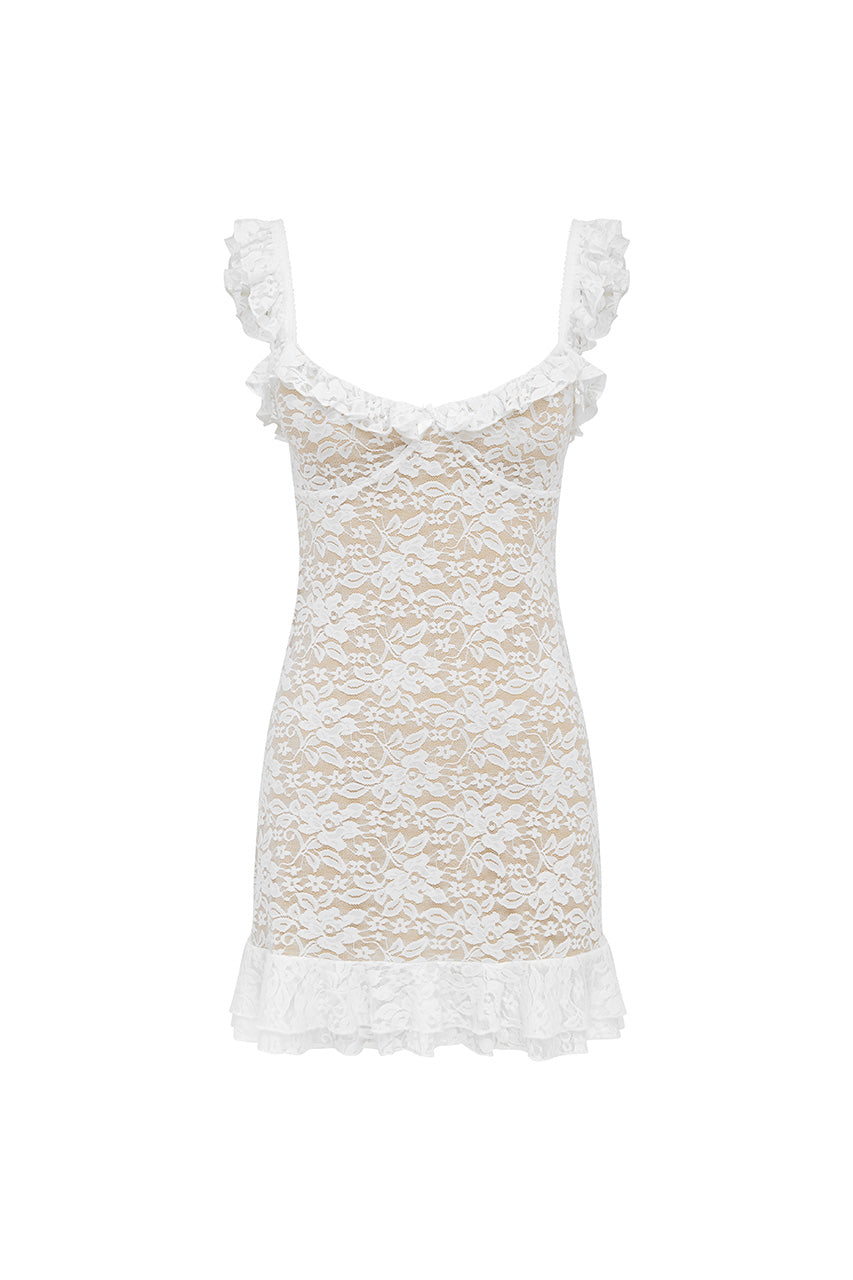 Crafted from delicate lace with frill details our Ava Mini Dress will be your favourite flirty girly piece.