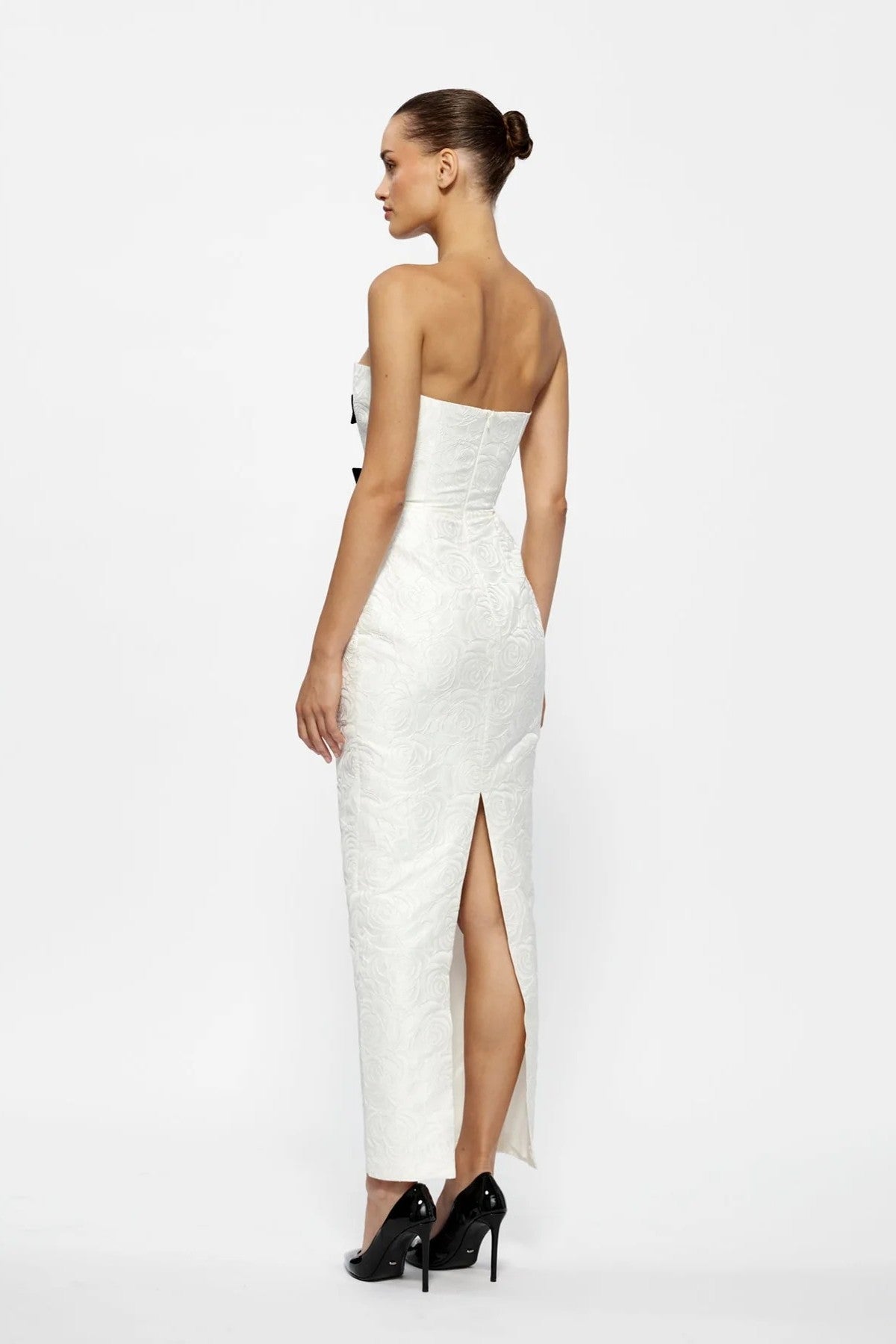 Effortlessly graceful, we introduce the Kiera Dress. Featuring a strapless cut with a plunging neckline, detailed with intricate patterning and accents across the body. Finishing with a flirty and feminine finish with two bows at the bodice. This gown moves with elegance and ease, made with a gorgeous Brocade for understated elegance. Perfect for special celebrations and event dressing.