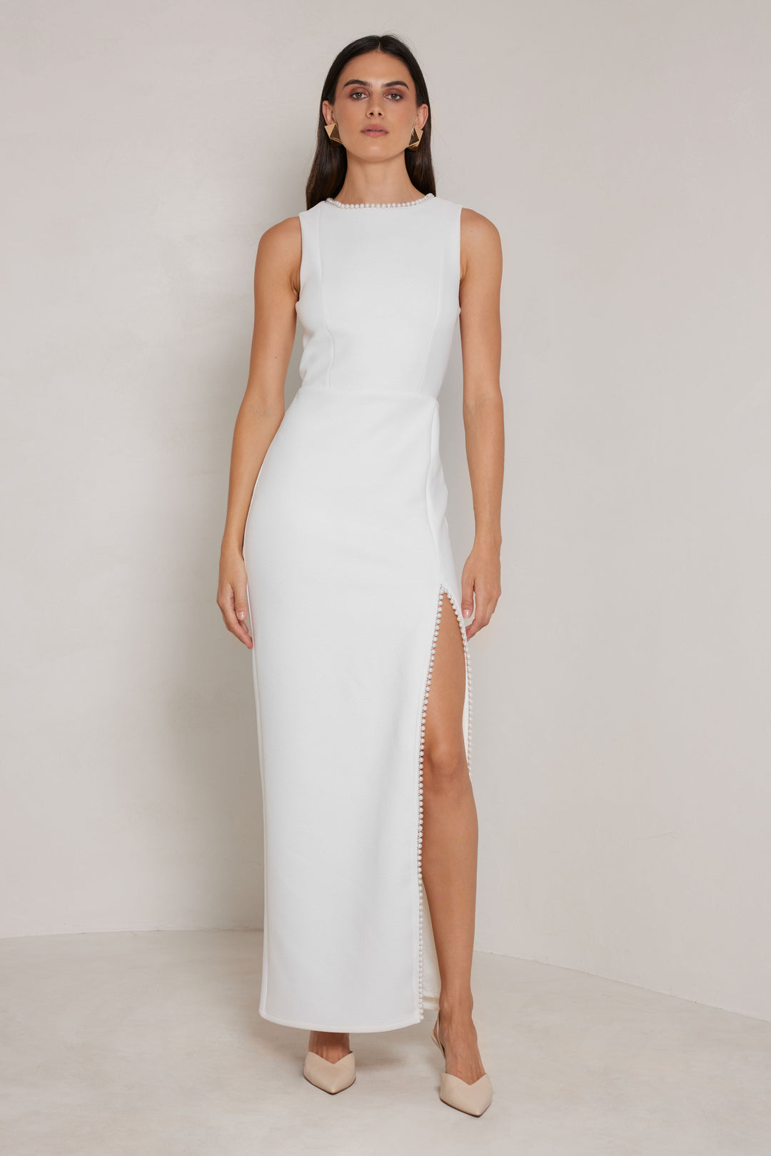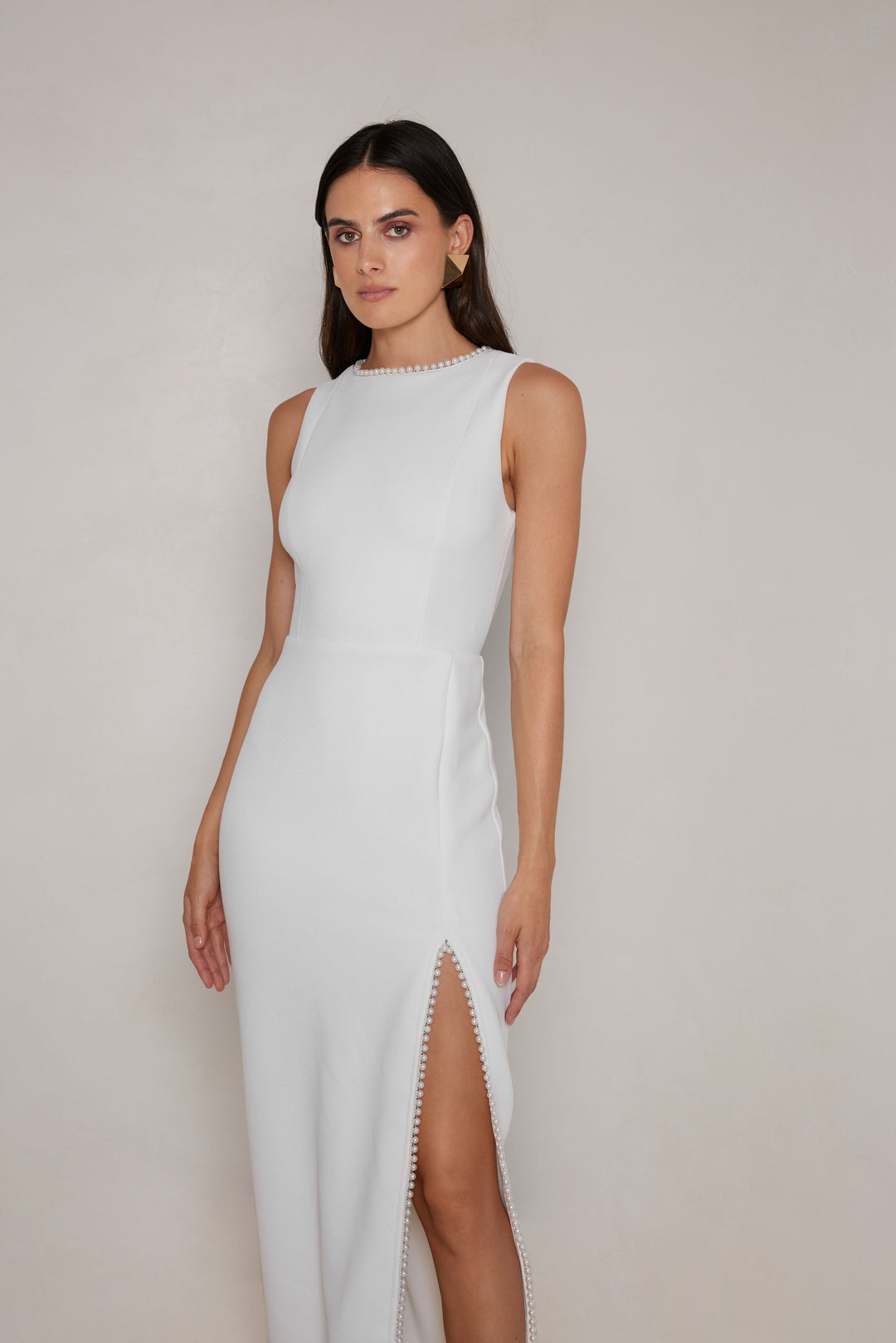 Elevate your evening wardrobe with this stunning sleeveless gown. The sleek, form-fitting silhouette is complemented by a sophisticated high slit, adorned with delicate pearls that add a touch of elegance and glamour. The neckline is also embellished with pearls, creating a refined and luxurious look.