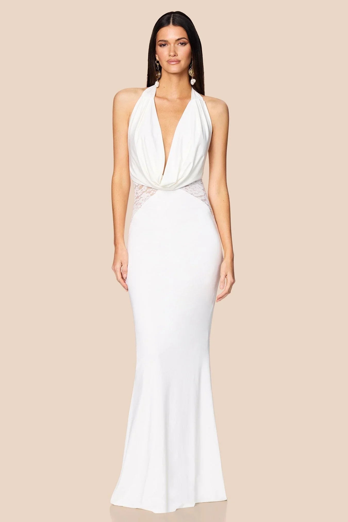 The Nookie Lala Gown is an elevated plunge gown with a deep draped neckline and lace panels at the side waist. It features a halter tie and an invisible zip at the back. It is crafted in our signature jersey fabrication. The dress is fully lined.