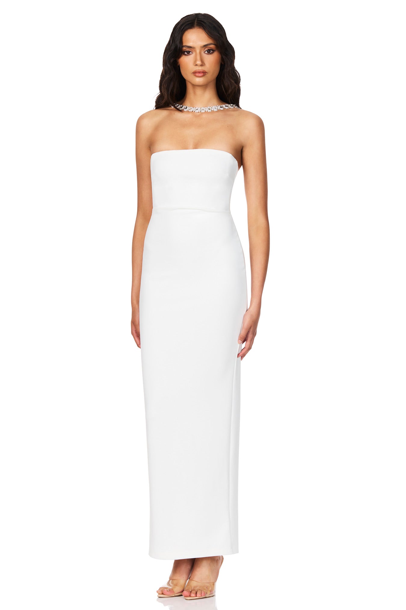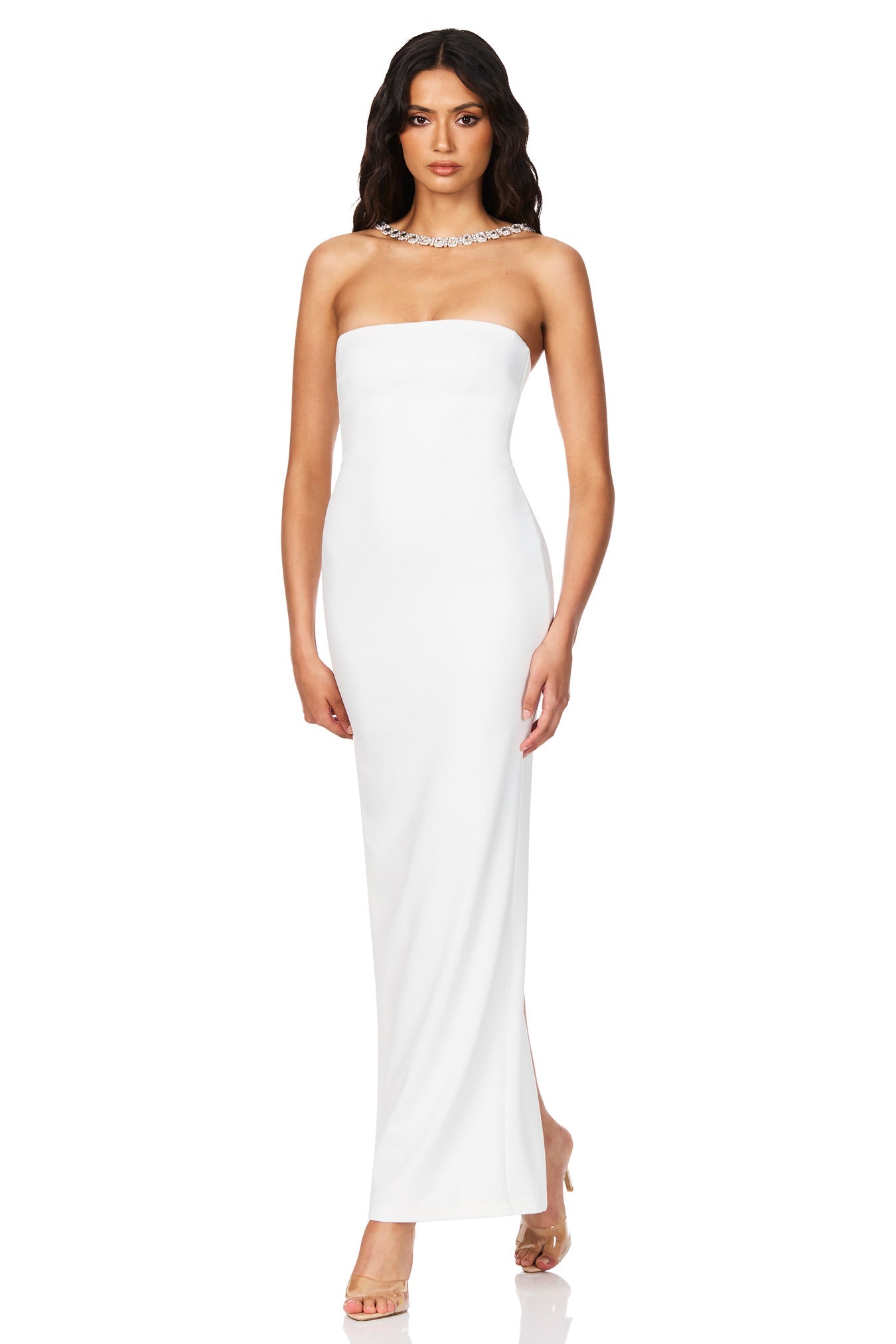 The Nookie Madison Gown is a timeless strapless column gown with elegant crystal strap along the front neck. Crystal strap is removable. Crafted in our signature stretch crepe, with structured bodice underneath and split at back hem. Invisible zip closure at back, fully lined.