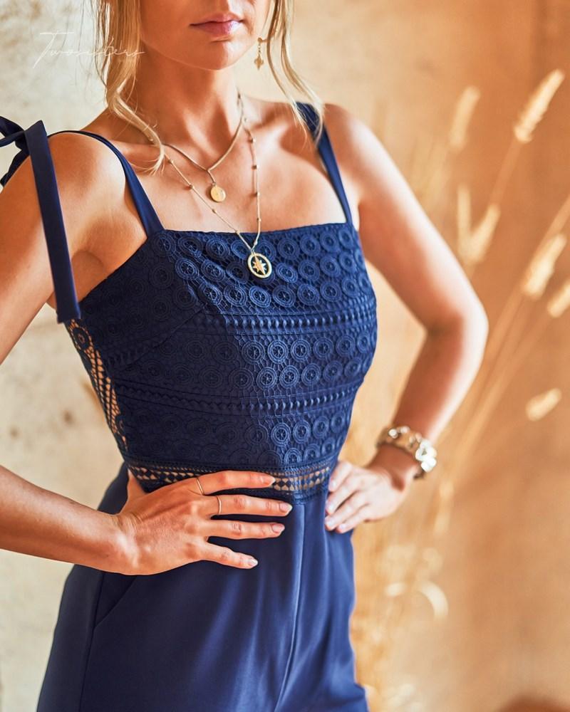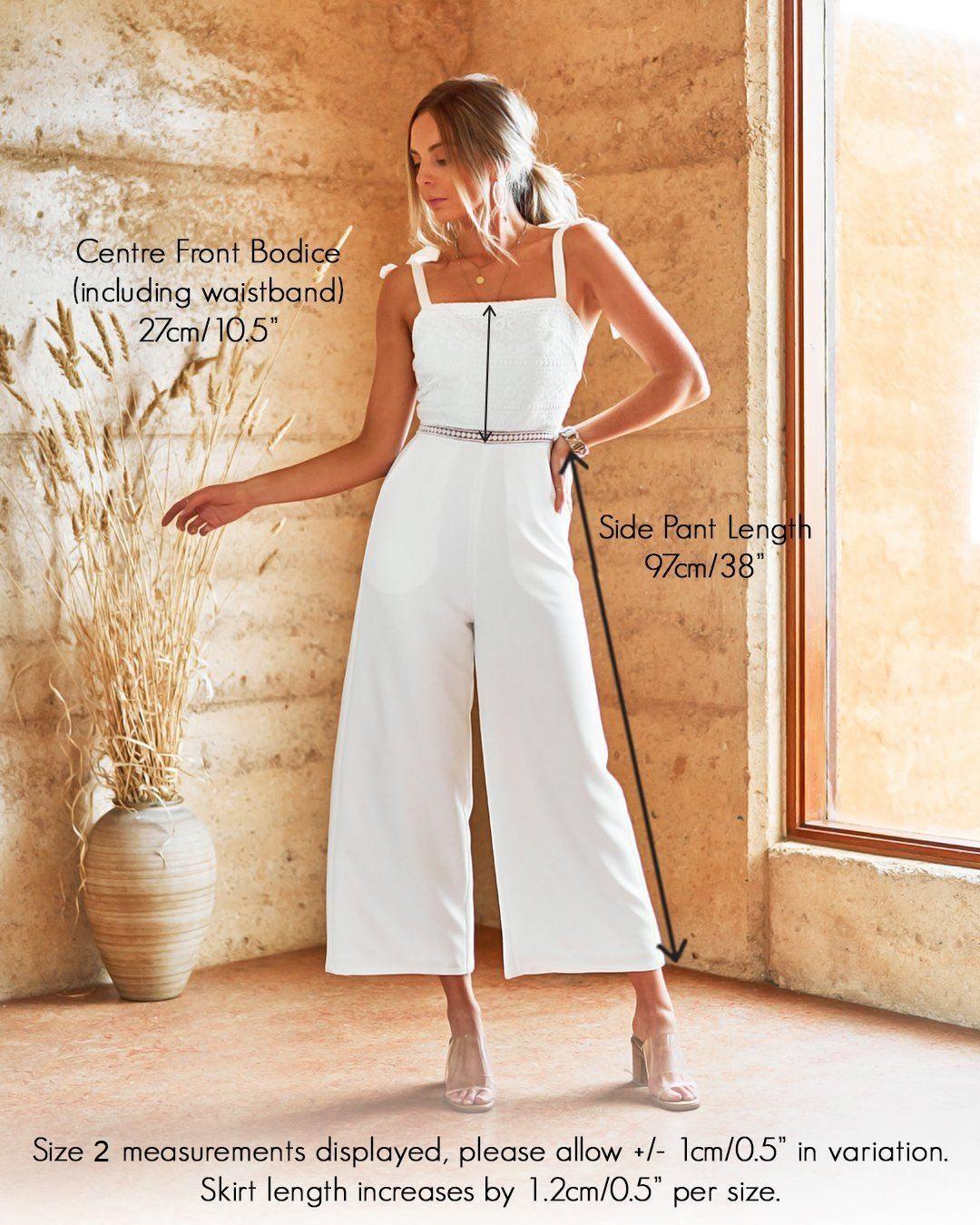 The Beryl Jumpsuit features gorgeous detailing at the front and back with a flattering cut. The lace-back bodice is intricately embroidered, with ribbon-tie straps and super comfy flared pants and a sweet lace waistband. It is fully lined except for the lace waistband and has a center back zipper.