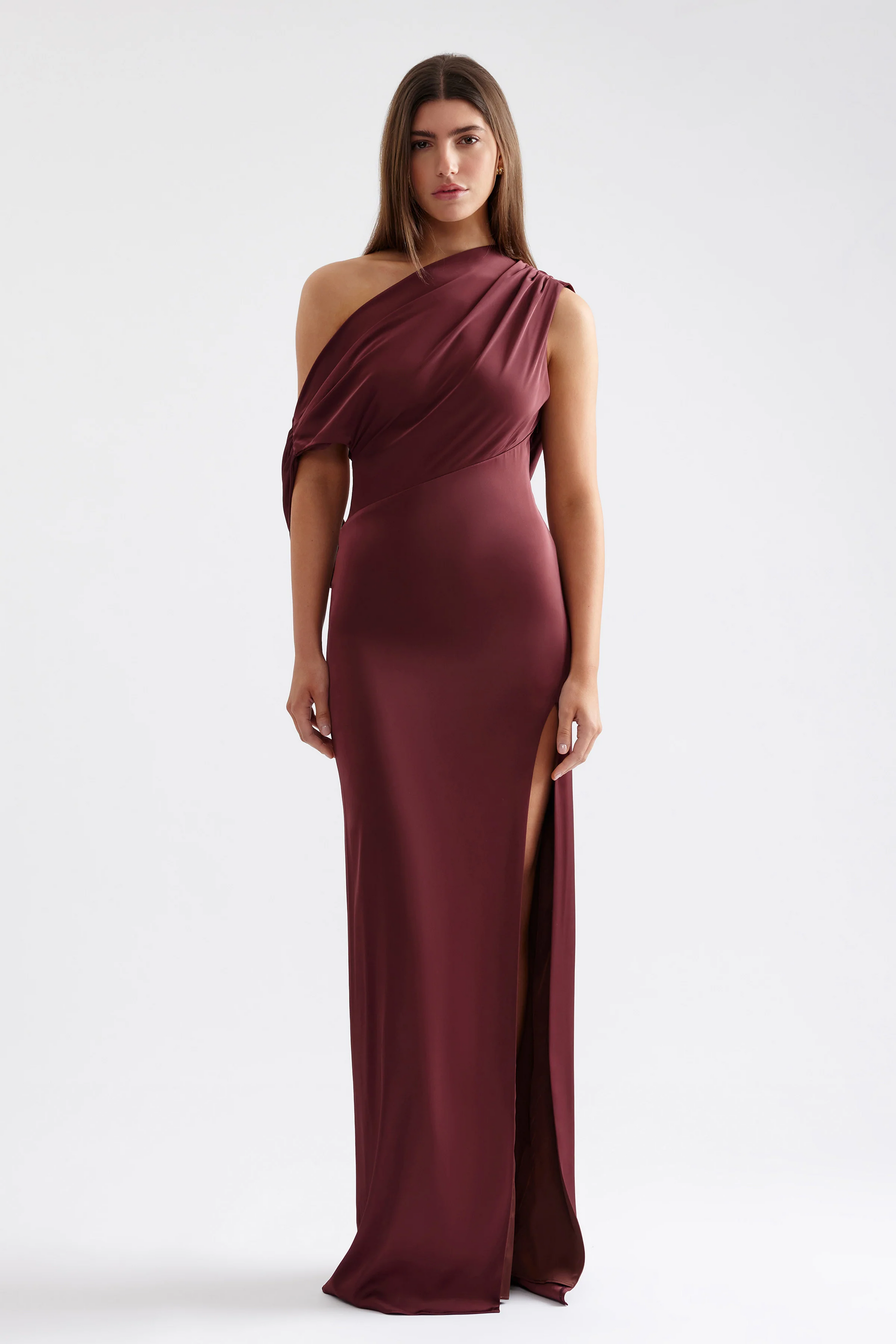 The Jayne Dress exudes effortless elegance, featuring a striking draped open back with an asymmetric neckline-one shoulder elegantly framed while the other drapes off for a unique touch. Crafted to hug the figure flawlessly, this design is completed with a daring thigh-high split on the left leg, making it a stunning choice for any occasion.