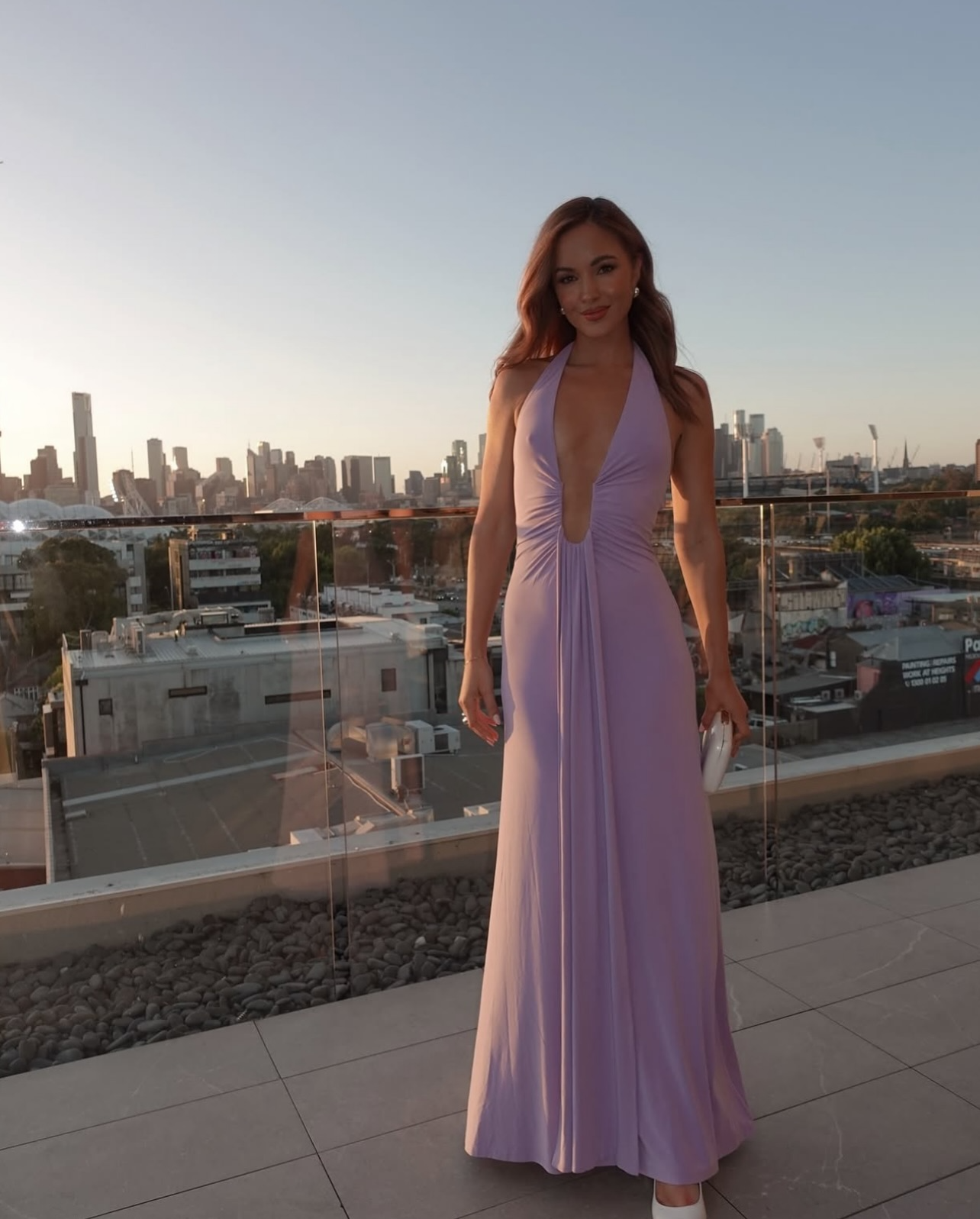 The Misha 'Jennifer' Cupro Maxi Dress in Lilac, a captivating and sexy silhouette that is a true reflection of MISHA's brand DNA. The plunging halter neckline that is finished with an adjustable wire and waterfall sash detailing. Jennifer pushes the boundaries with her long clean lines that expose the wearers cleavage ever so subtly.