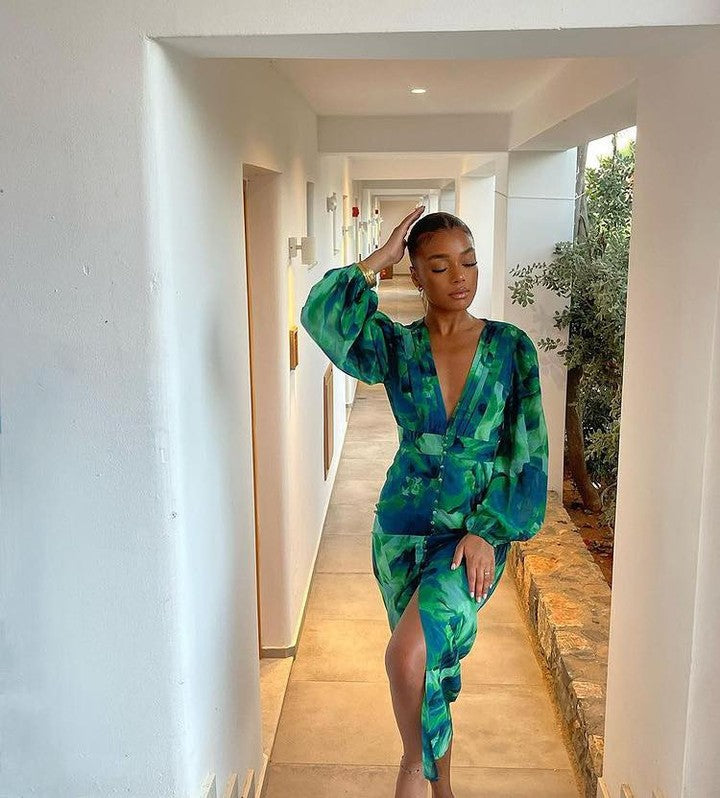 Our Karlita Midi Dress features a midi length, a v-neckline, button up detailing, a side split, no stretch and no lining. Please note this garment is sheer and must be worn with full briefs for coverages. Briefs not included.