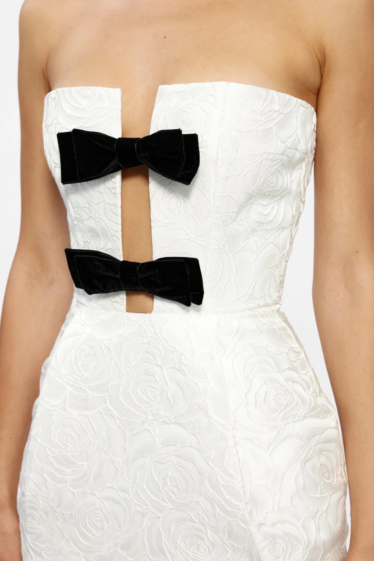 Effortlessly graceful, we introduce the Kiera Dress. Featuring a strapless cut with a plunging neckline, detailed with intricate patterning and accents across the body. Finishing with a flirty and feminine finish with two bows at the bodice. This gown moves with elegance and ease, made with a gorgeous Brocade for understated elegance. Perfect for special celebrations and event dressing.