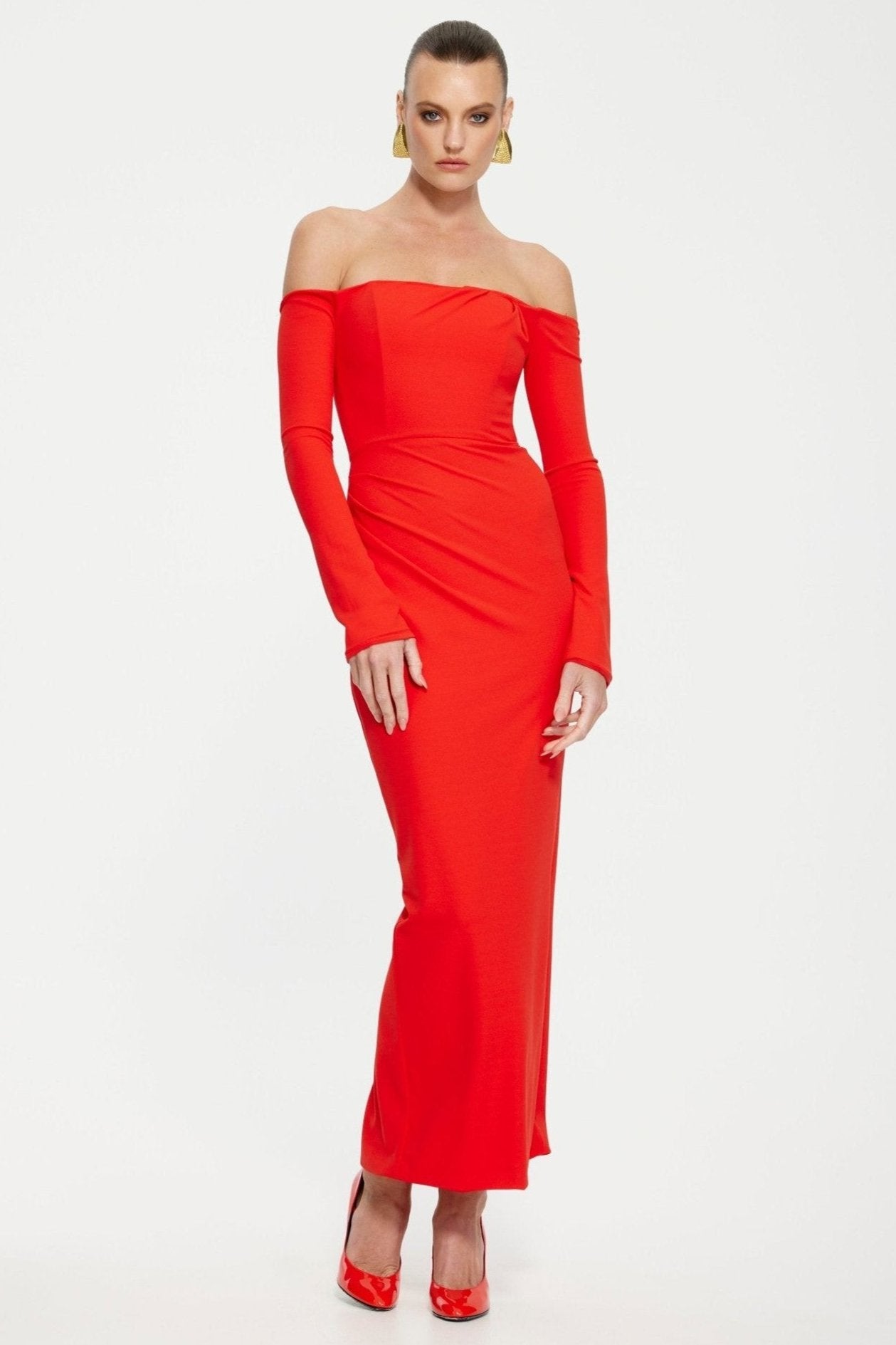 The Kristie Midi Dress is an off shoulder long sleeve dress with boning at the waist for a fitted silhouette. Slight ruching along the neckline.