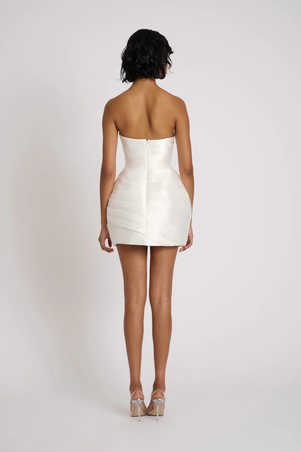 Defined angled design folds throughout the dress create a sculpted effect that enhances the bride's figure. The voluminous, structured mini skirt adds a playful yet chic touch, making the Melody Dress perfect for a bride who wants to make a statement on her special day.