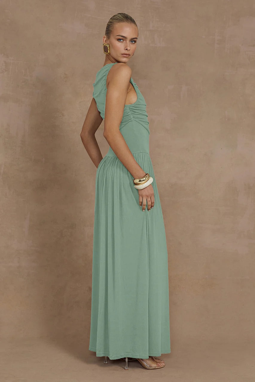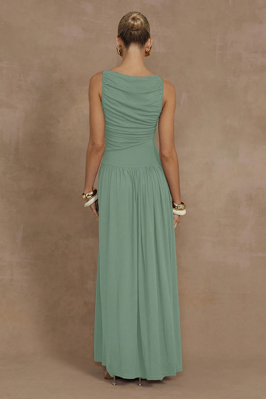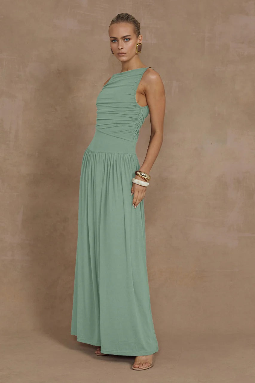 Our Nalla Maxi Dress showcases effortless elegance, with a boat neck and ruching throughout, it’s a versatile and timeless piece.