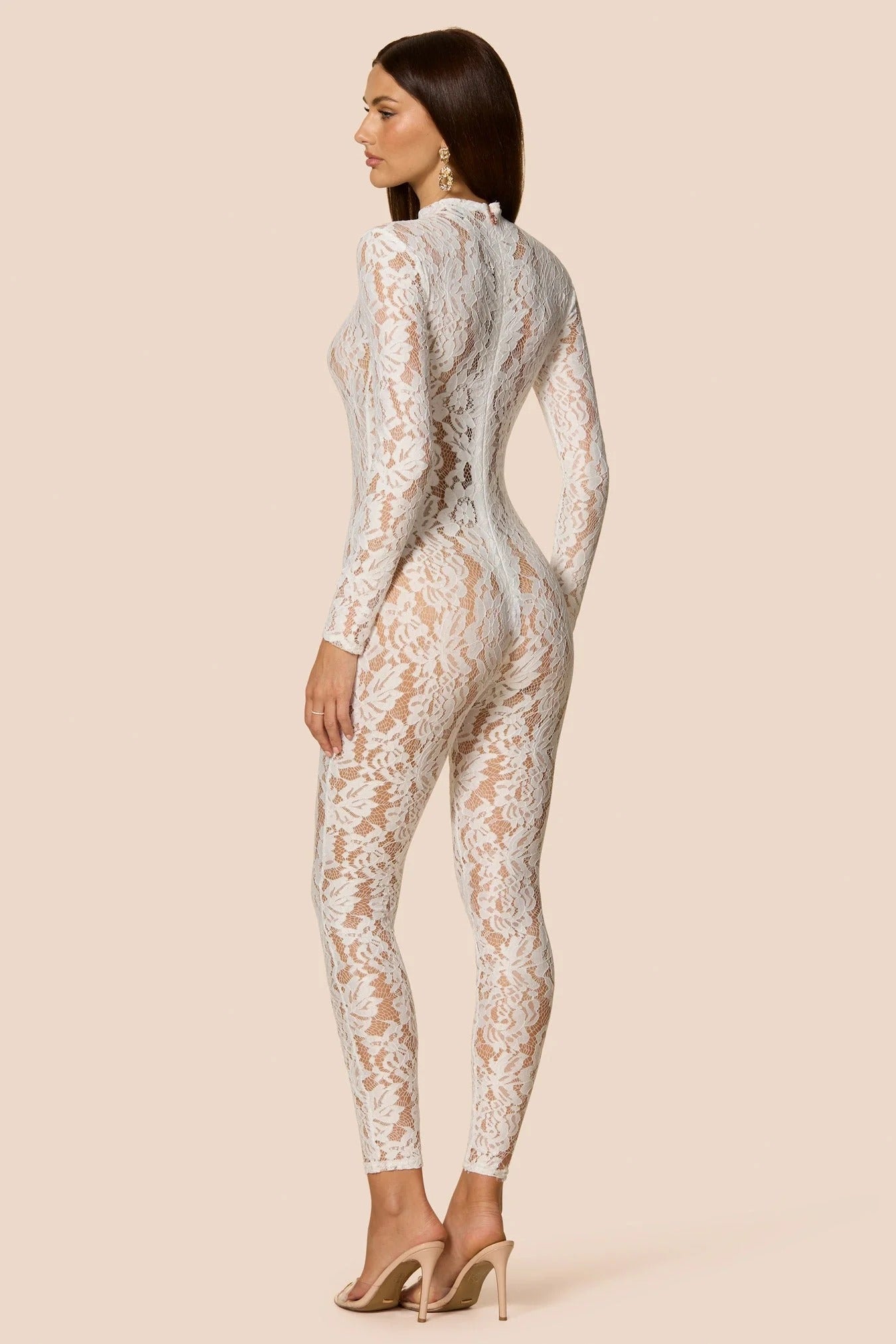 The Nookie Lennox Catsuit is unapologetically bold and irresistibly chic. This Lace Jumpsuit is a statement piece like no other. Crafted from a fine stretch lace, this figure-hugging design features a high neckline, sleek long sleeves, and a body-contouring fit. It has an invisible zip at the back and is unlined.