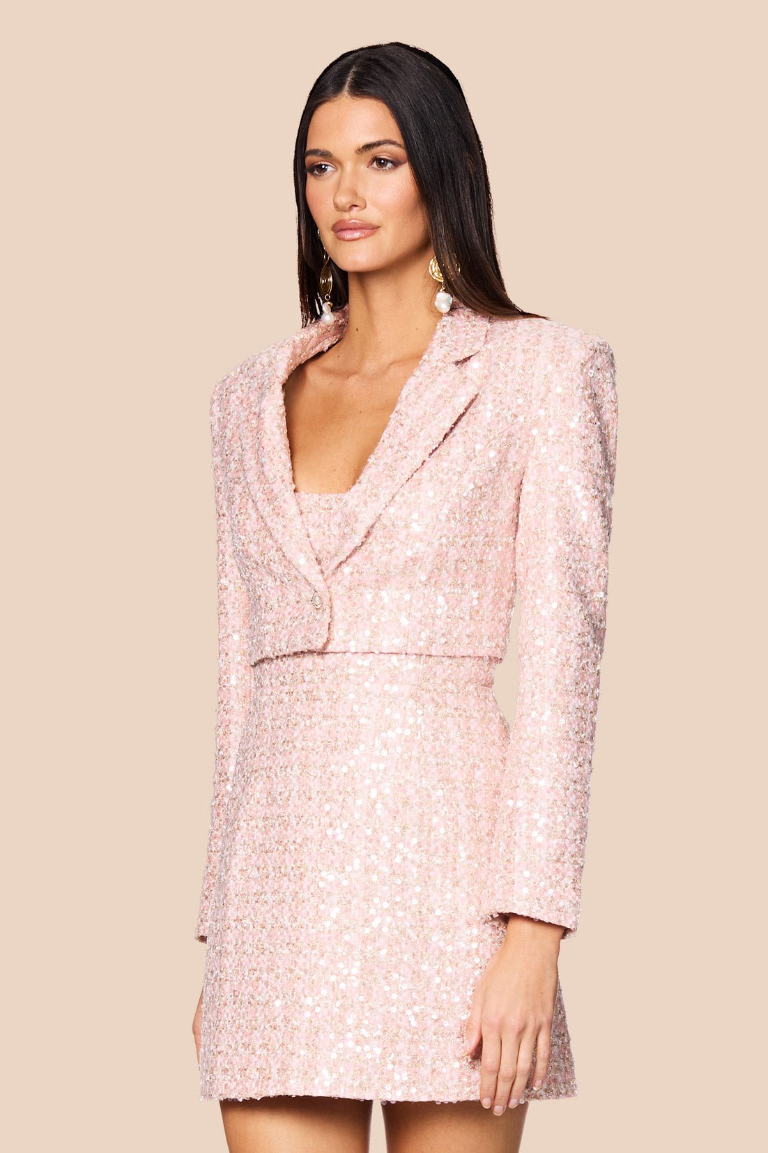 The Nookie Tyler Blazer is a lux cropped jacket with a single button closure. It is crafted in a tweed suiting with mini sequins and is fully lined.