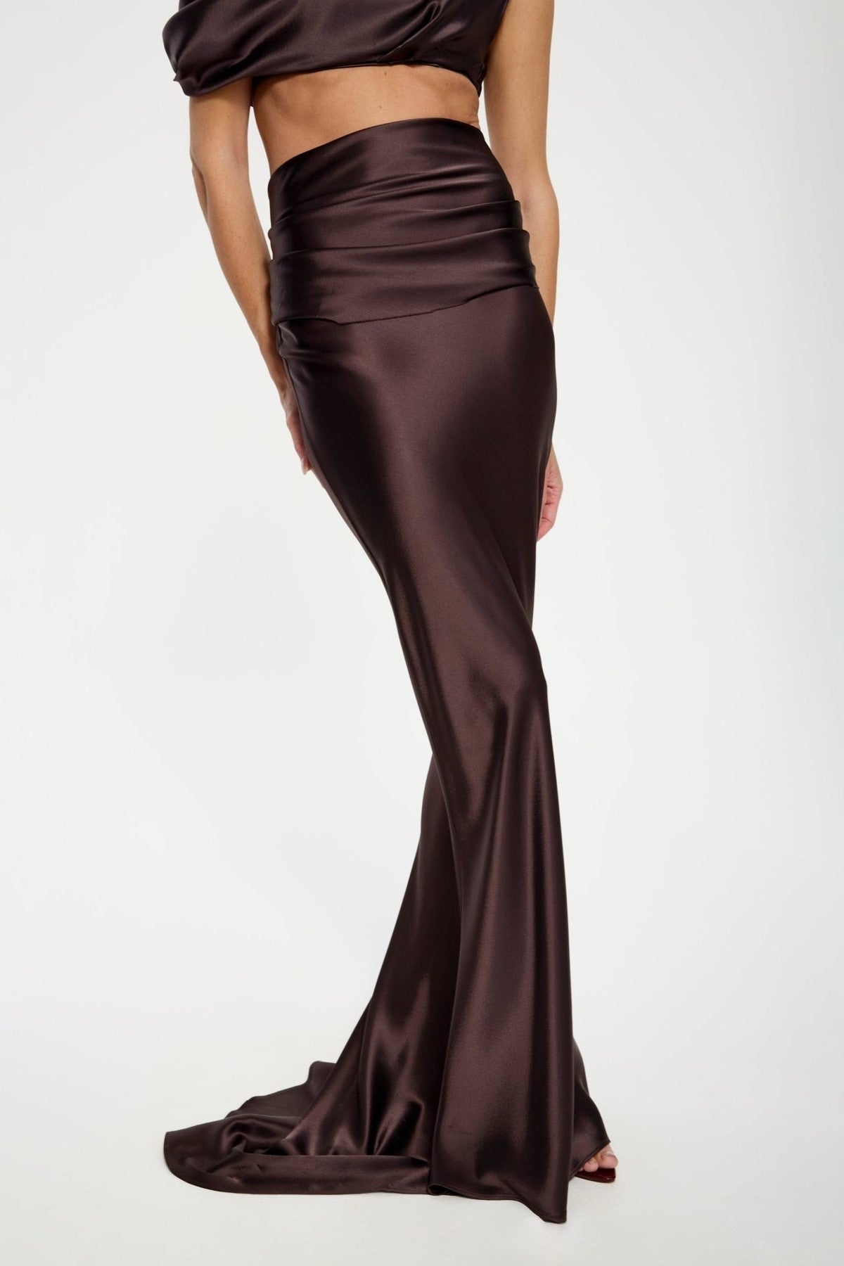 Satin maxi length skirt with structured ruching and drape detailing at waist. Designed to be worn with the matching Perez Top.