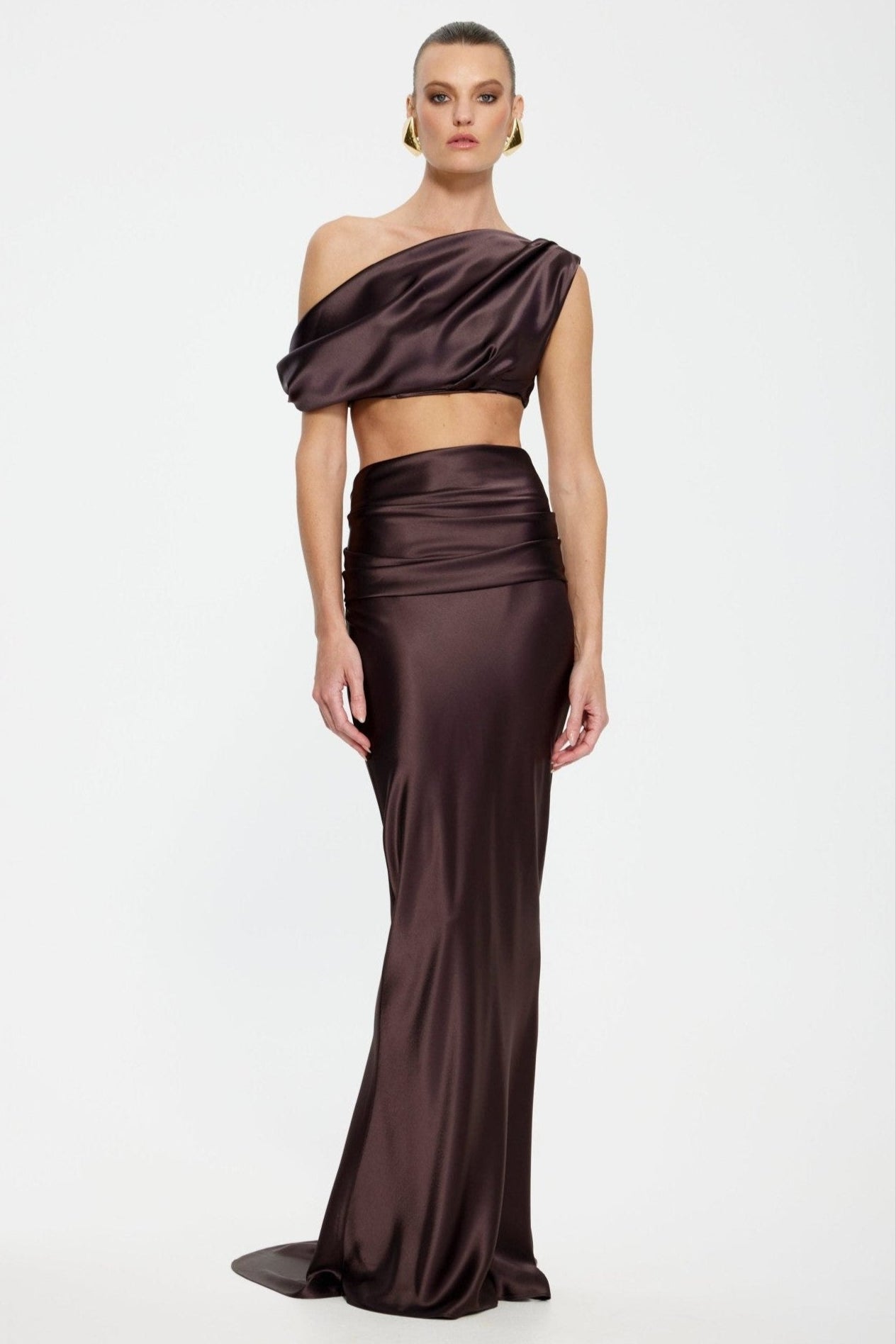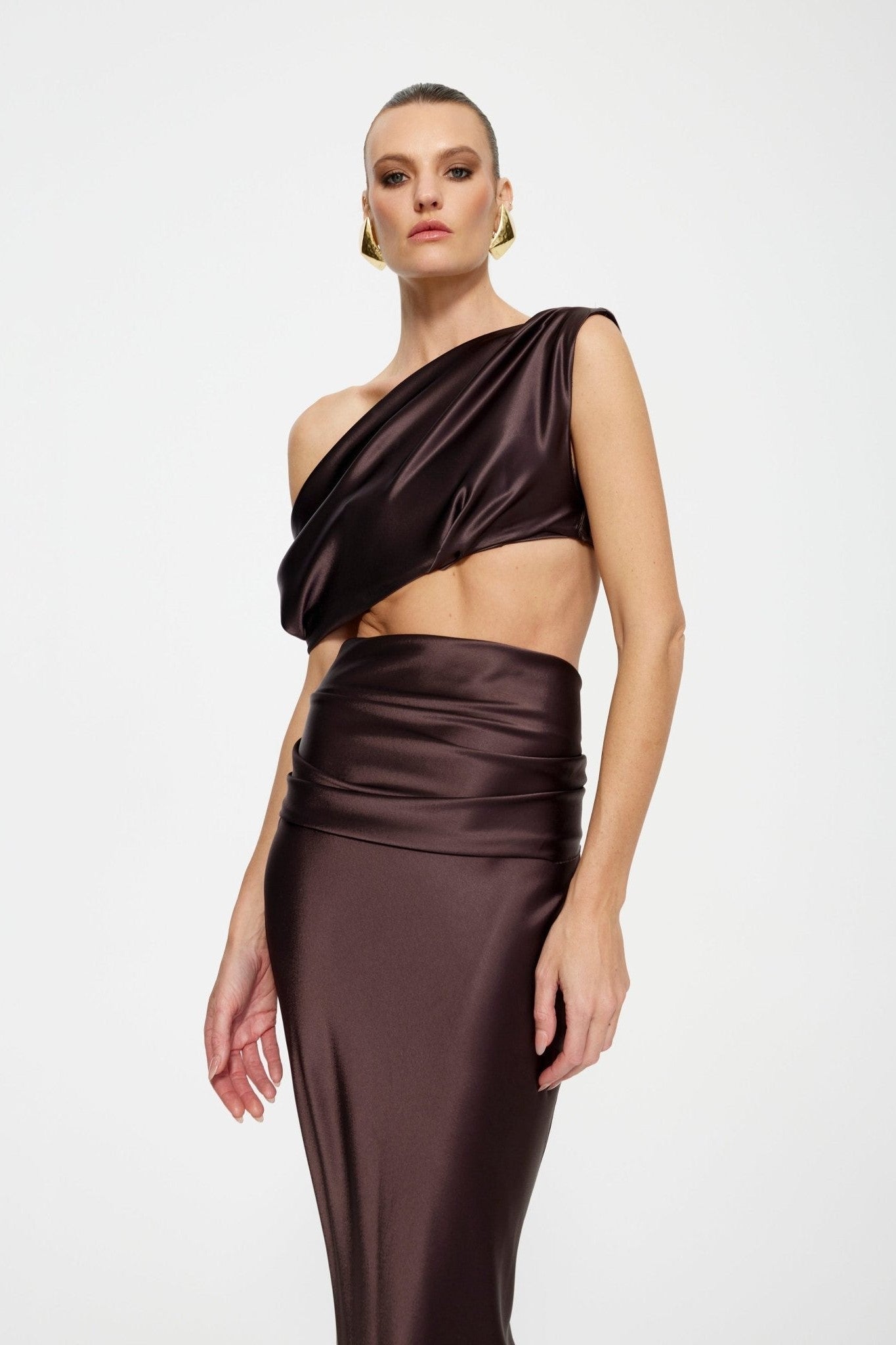 Satin asymmetrical top. Designed to be worn with the matching Perez Skirt.