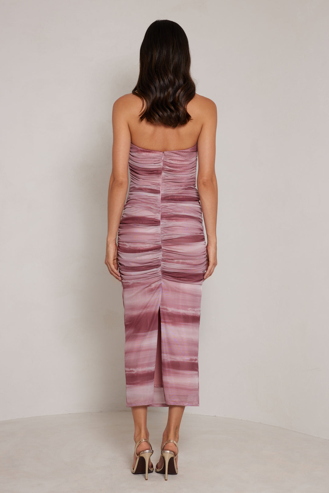 This dress is a strapless, form-fitting design with a pink, horizon-like pattern. It has a ruched texture, creating a flattering silhouette. The length is midi, making it elegant and suitable for any occasion.