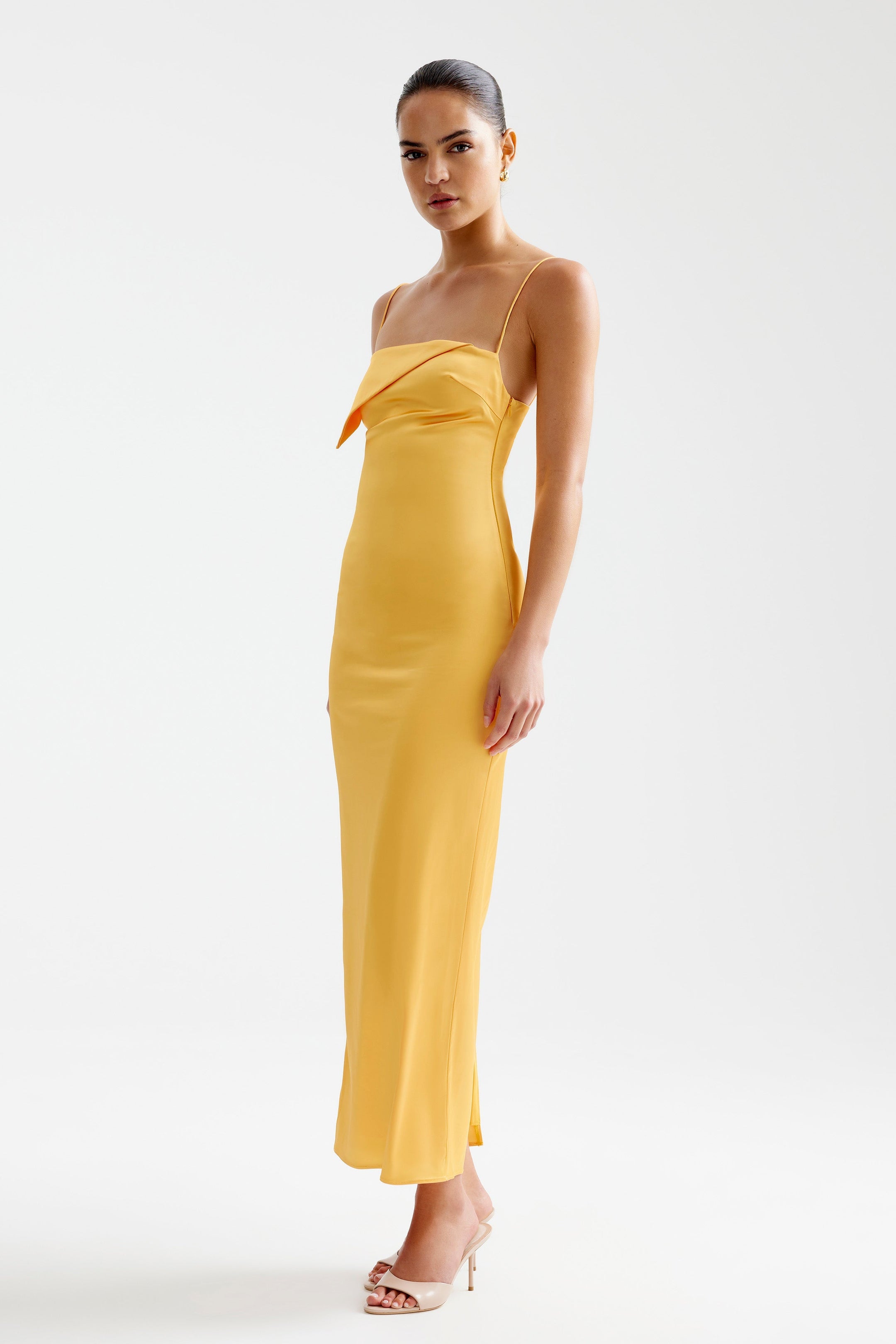 The Rayna Dress is a sleek and elegant ankle-length design. Featuring a straight silhouette, it is crafted from our luxe satin with a bodice overlay flap detail at the front and back. The straight neckline and adjustable shoulder straps ensure a perfect fit, making it a timeless choice for any occasion
